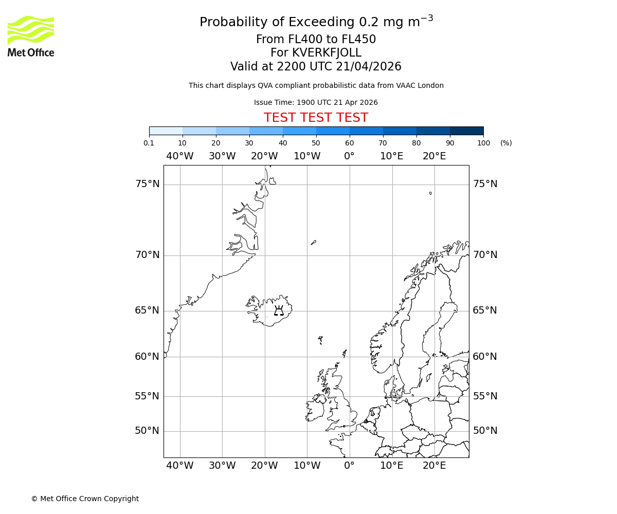 Probability of exceeding 0.2 milligrams per metre cubed. From 400 to 450 for KVERKFJOLL. Valid at 1900 UTC 21/04/2026