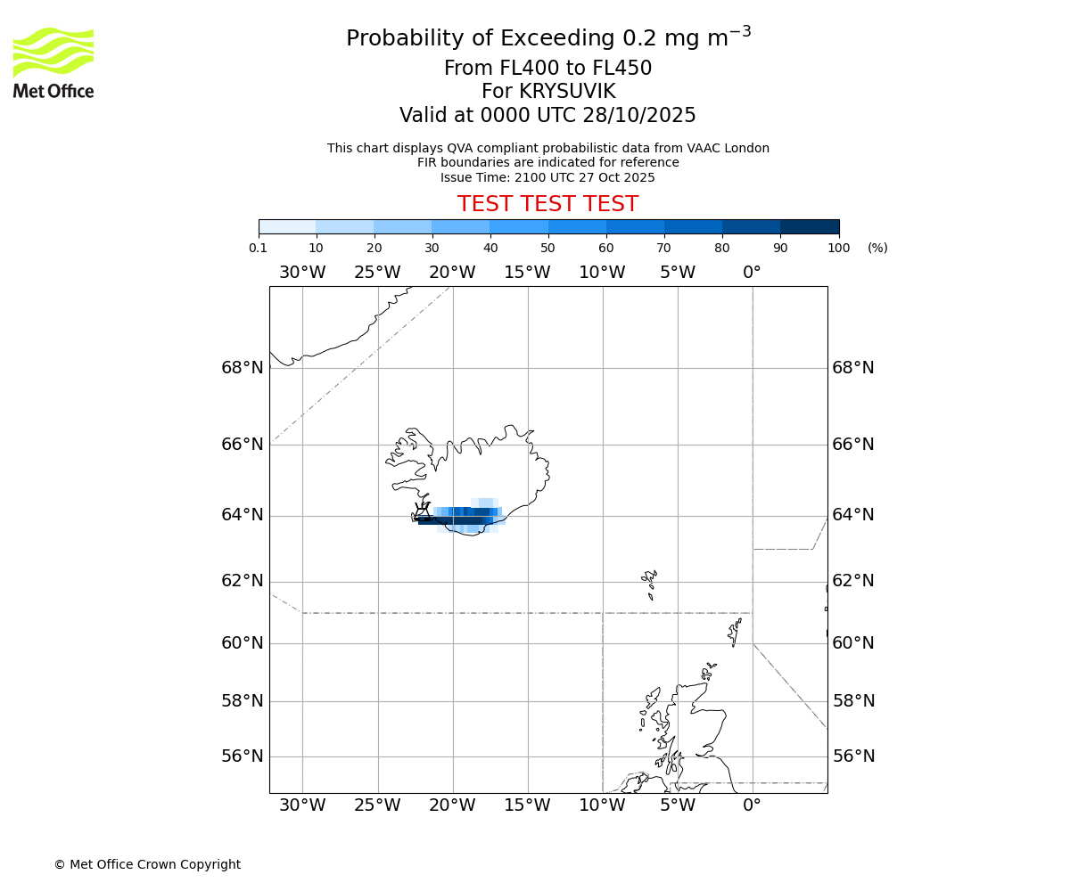 Probability of exceeding 0.2 milligrams per metre cubed. From 400 to 450 for KRYSUVIK. Valid at 2100 UTC 27/10/2025
