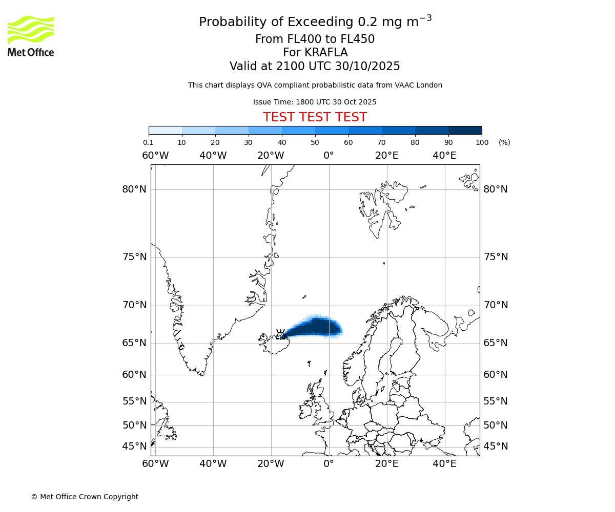 Probability of exceeding 0.2 milligrams per metre cubed. From 400 to 450 for KRAFLA. Valid at 1800 UTC 30/10/2025