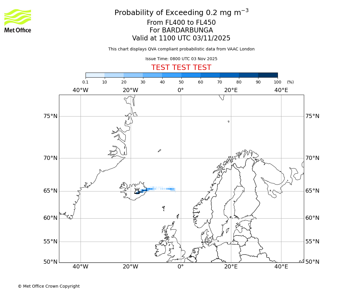 Probability of exceeding 0.2 milligrams per metre cubed. From 400 to 450 for BARDARBUNGA. Valid at 0800 UTC 03/11/2025