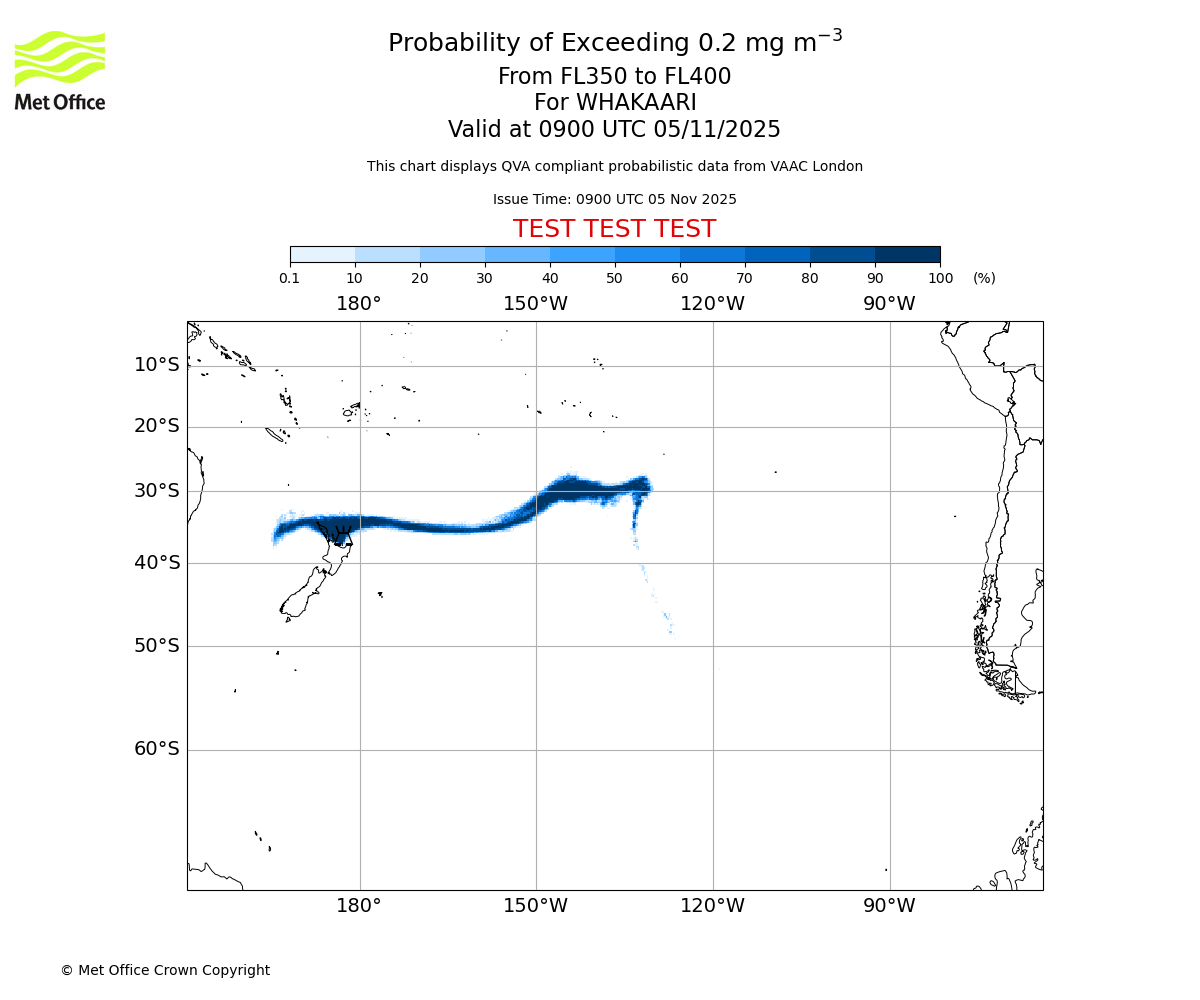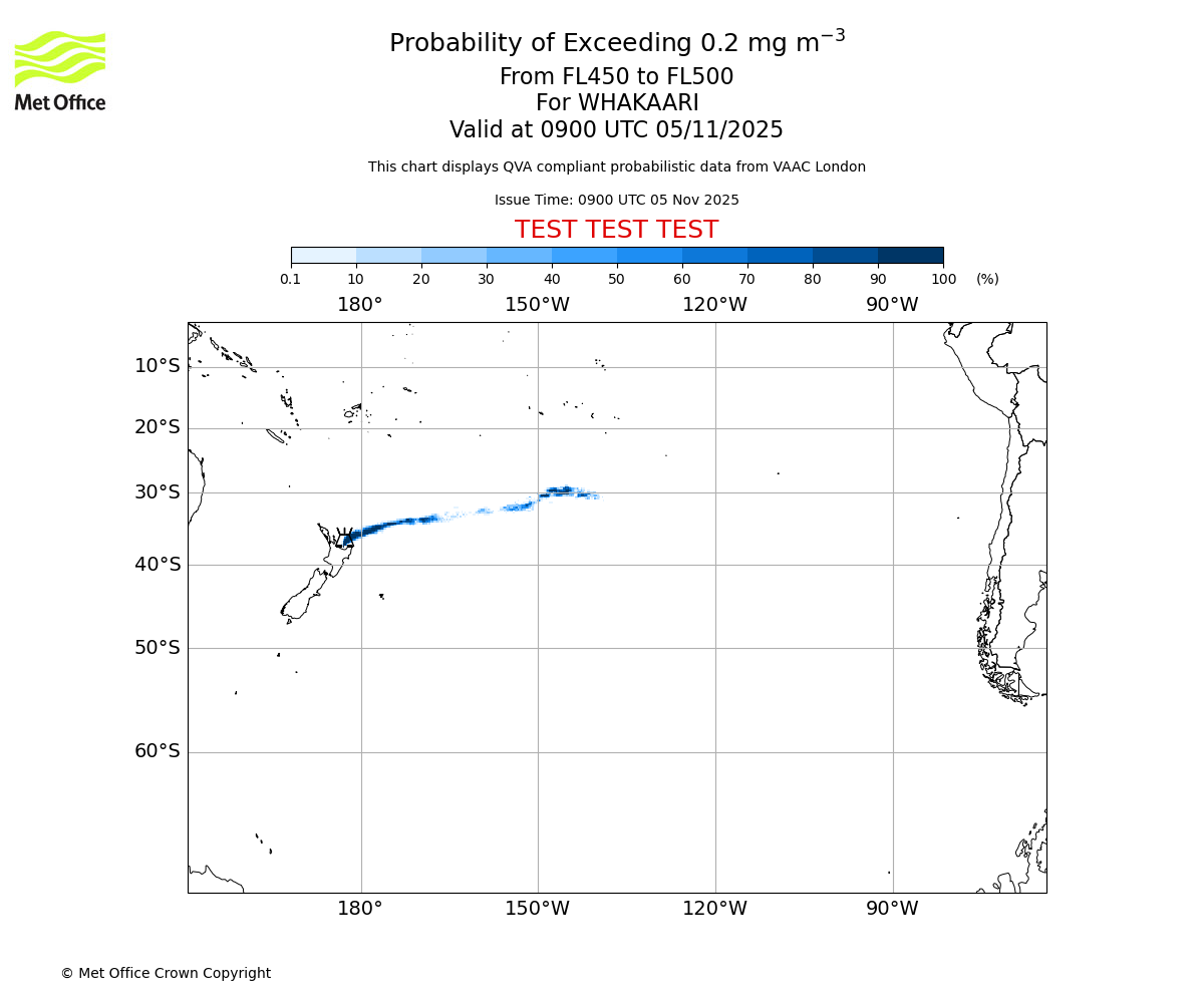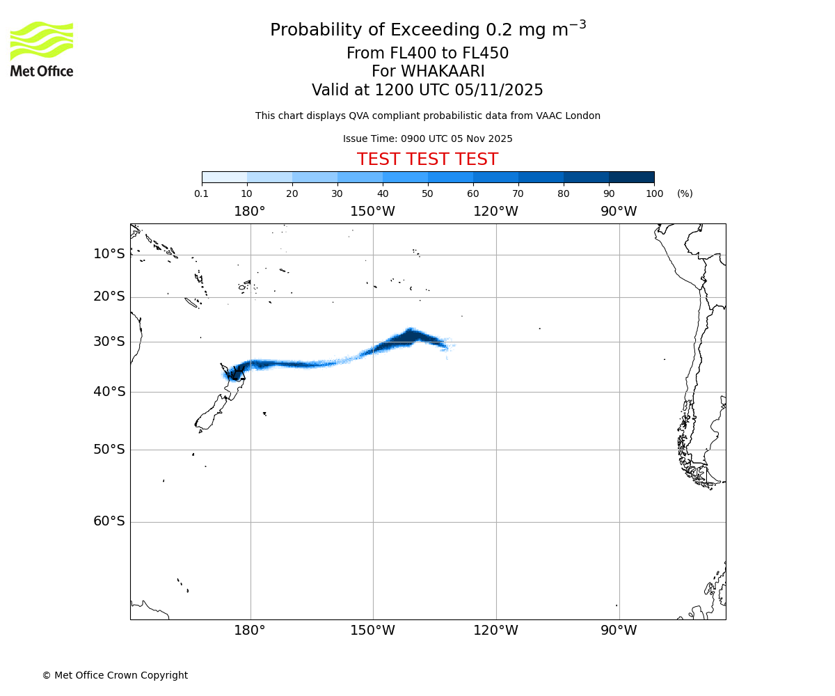 Probability of exceeding 0.2 milligrams per metre cubed. From 400 to 450 for WHAKAARI. Valid at 0900 UTC 05/11/2025