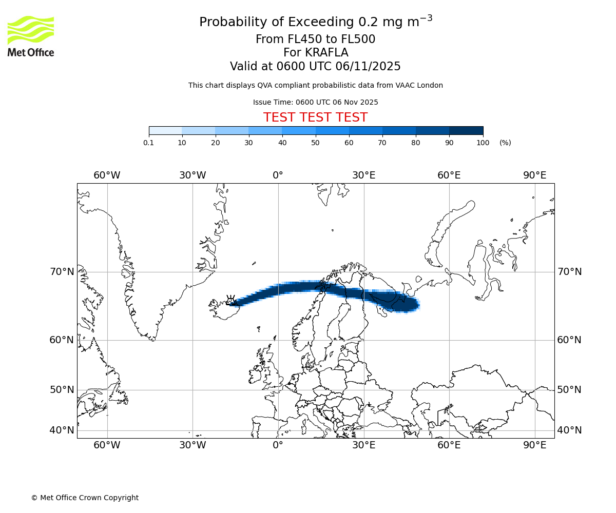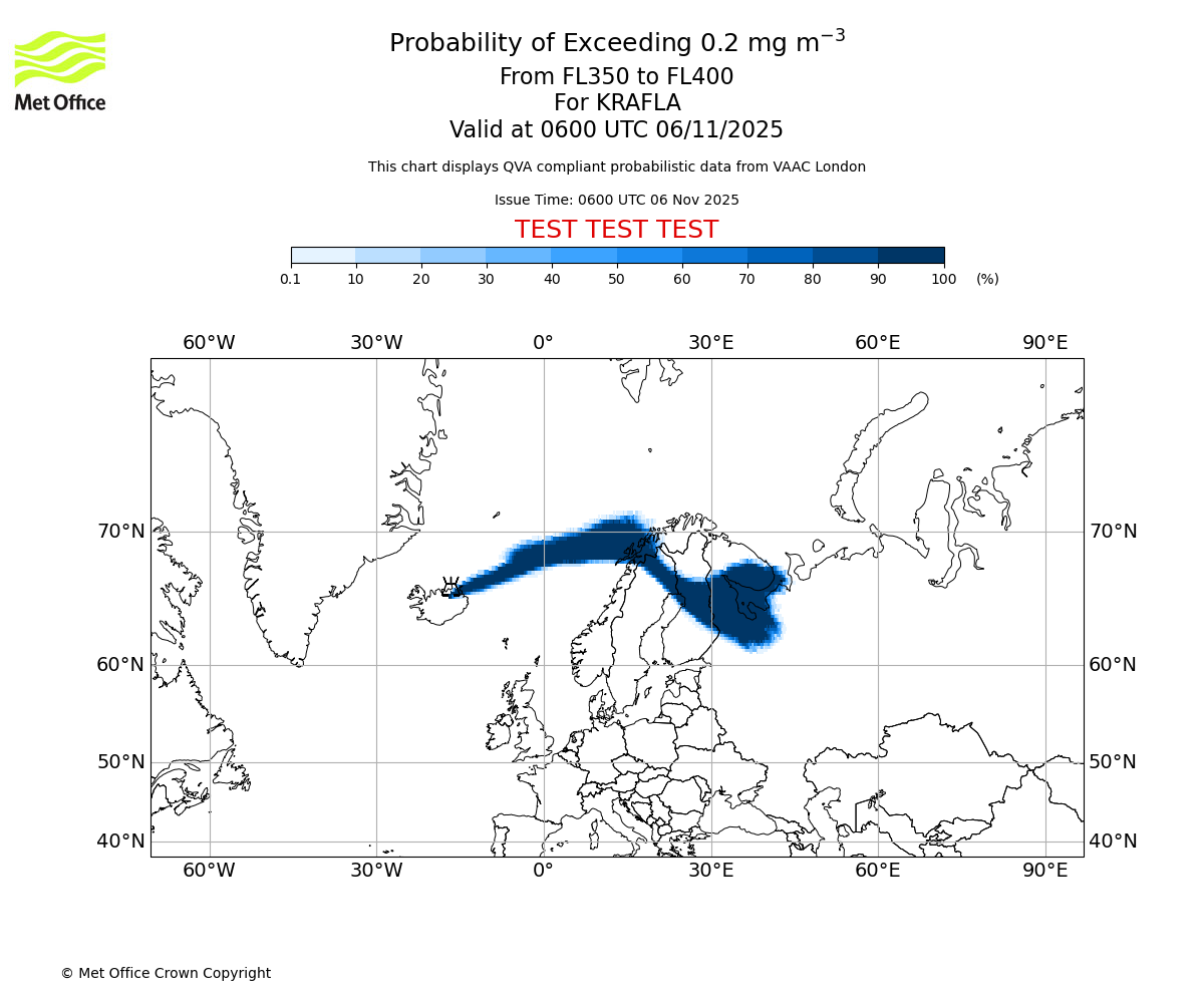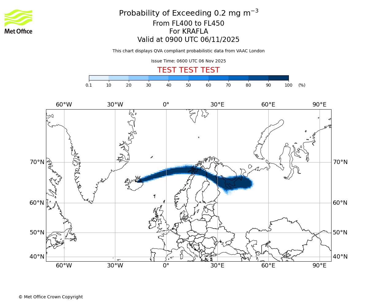 In accordance with ICAO Annex 3, Amendment 82 VAAC London will provide operational QVA forecasts from 27 November 2025 and these will be made available via a VAAC London QVA API information service. These charts are currently provided for test and evaluation purposes (not for operational use) until the introduction of the operational service.