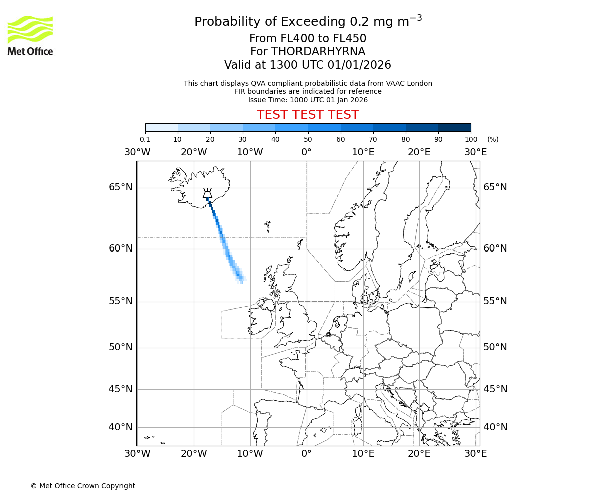 Quantitative Volcanic Ash charts (QVA) are produced in accordance with International Civil Aviation Organization (ICAO) Annex 3 requirements and are provided as well as the London Volcanic Ash Advisory Graphics (VAG) and Advisories (VAA). The lowest QVA threshold (0.2 mg/m³) matches to the areas depicted in the VAA and VAG. Both expected ash concentration and probabilistic forecast information is provided in the chart viewer below for eruptions occurring in the London Volcanic Ash Advisory Centre (VAAC) area of responsibility.