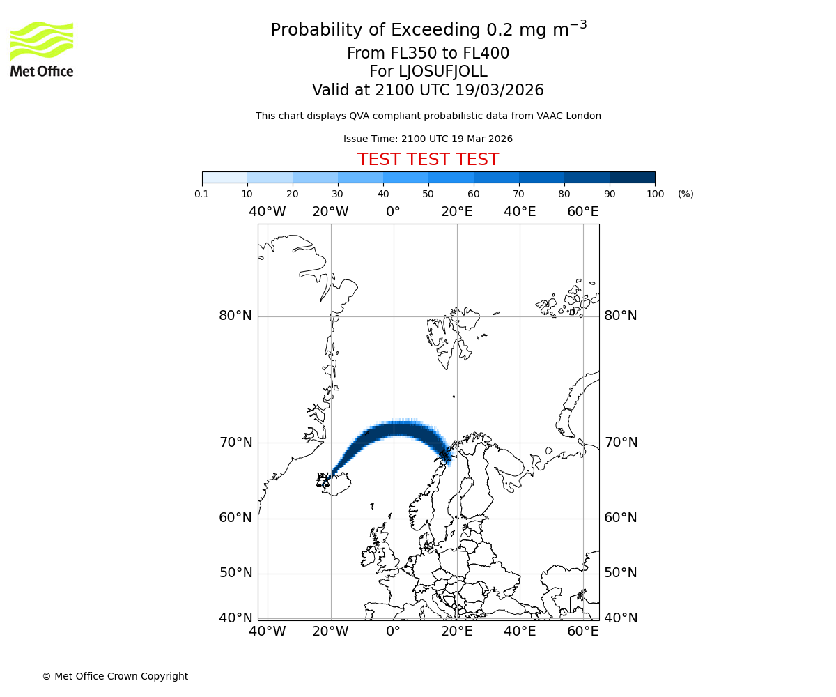 Quantitative Volcanic Ash charts (QVA) are produced in accordance with International Civil Aviation Organization (ICAO) Annex 3 requirements and are provided as well as the London Volcanic Ash Advisory Graphics (VAG) and Advisories (VAA). The lowest QVA threshold (0.2 mg/m³) matches to the areas depicted in the VAA and VAG. Both expected ash concentration and probabilistic forecast information is provided in the chart viewer below for eruptions occurring in the London Volcanic Ash Advisory Centre (VAAC) area of responsibility.