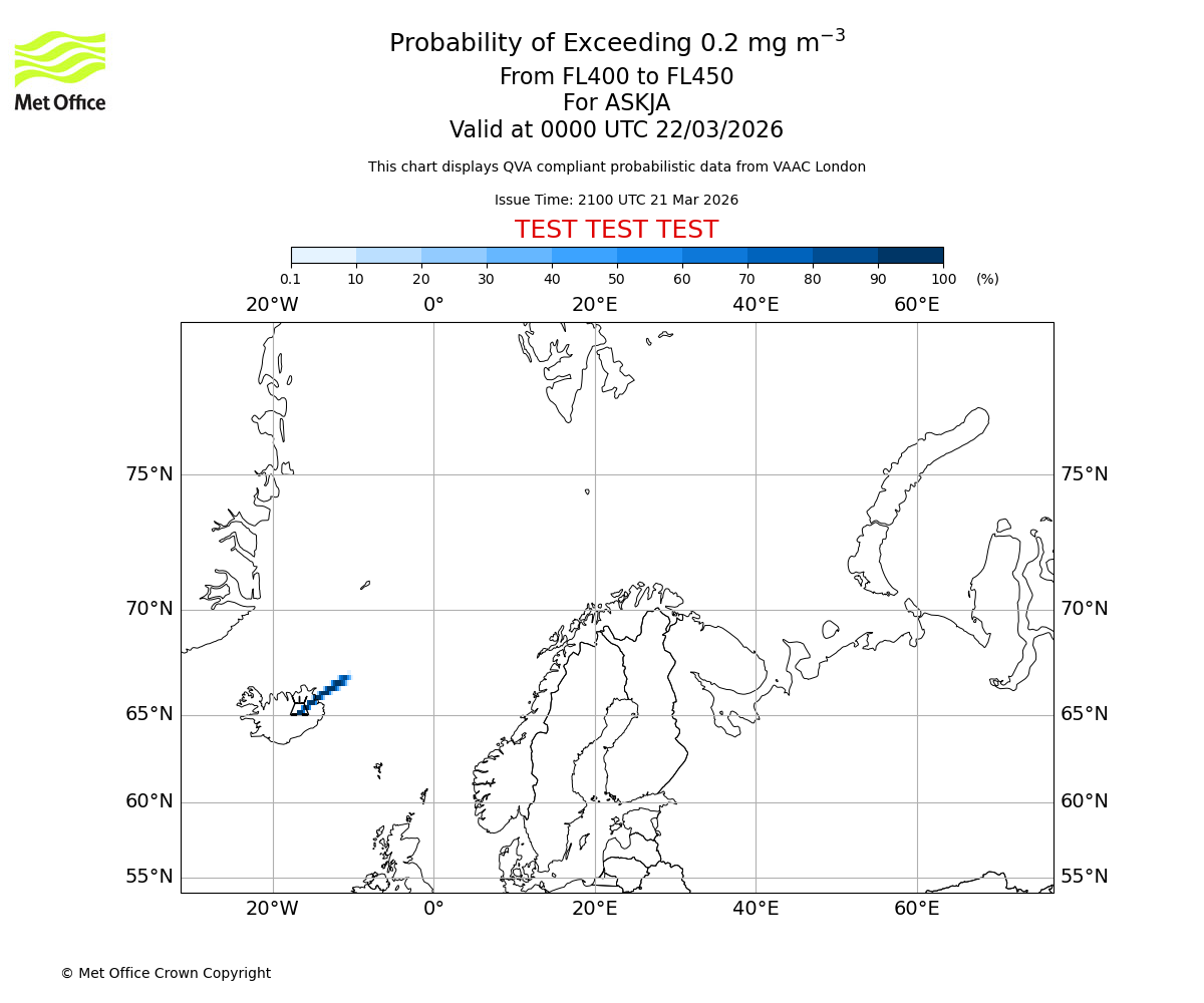 Probability of exceeding 0.2 milligrams per metre cubed. From 400 to 450 for ASKJA. Valid at 2100 UTC 21/03/2026