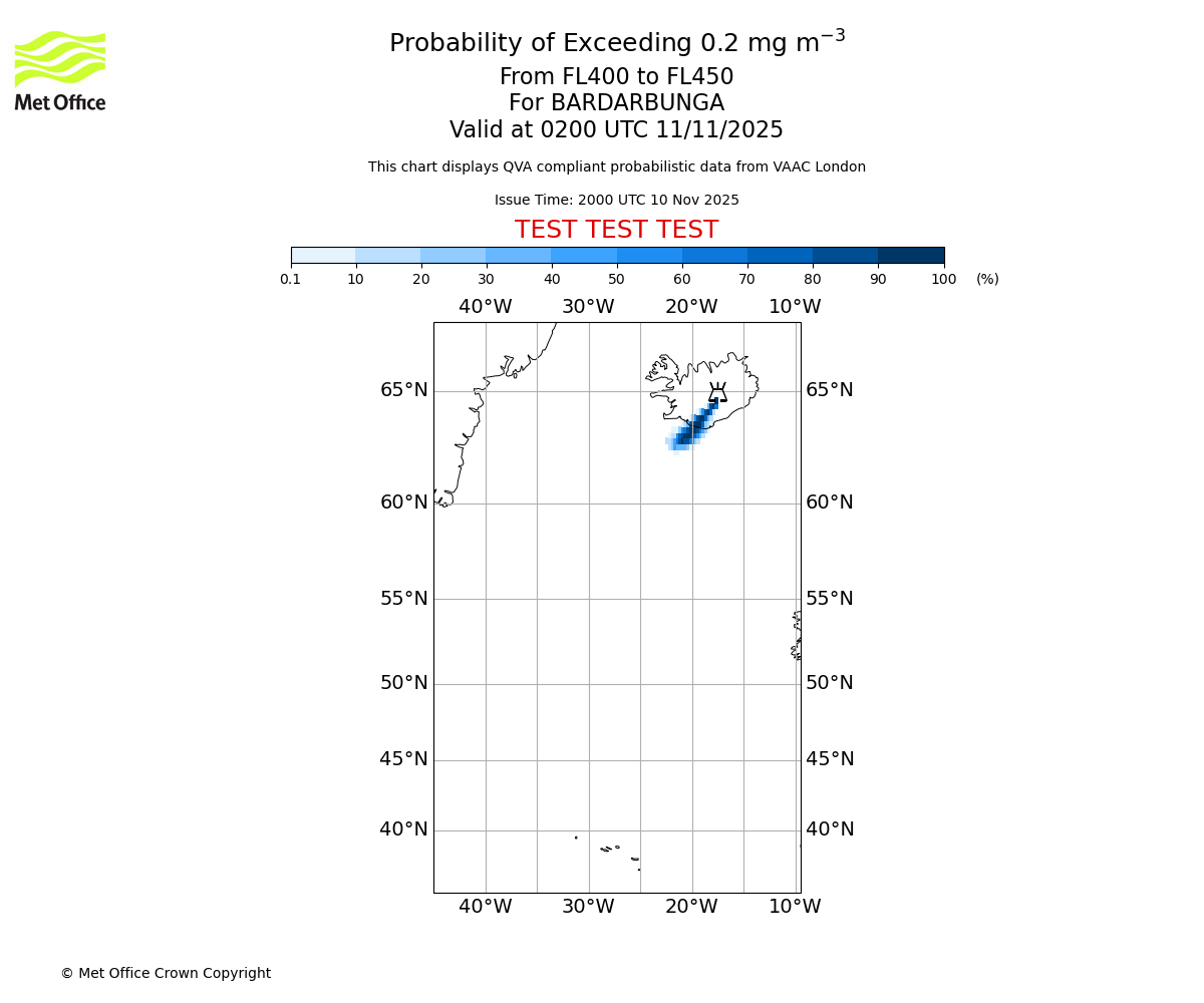 Probability of exceeding 0.2 milligrams per metre cubed. From 400 to 450 for BARDARBUNGA. Valid at 2300 UTC 10/11/2025