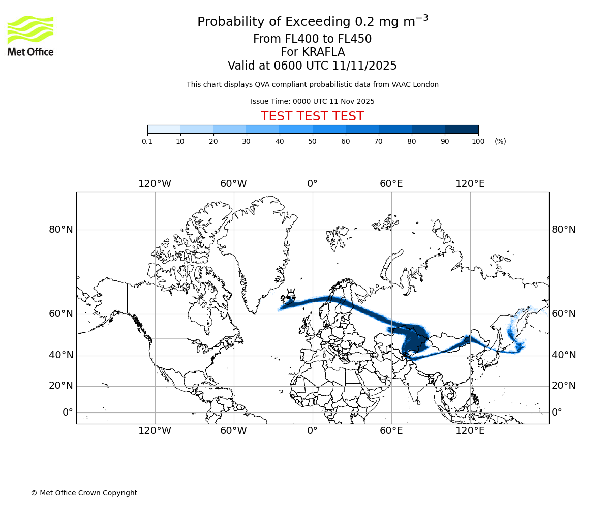 In accordance with ICAO Annex 3, Amendment 82 VAAC London will provide operational QVA forecasts from 27 November 2025 and these will be made available via a VAAC London QVA API information service. These charts are currently provided for test and evaluation purposes (not for operational use) until the introduction of the operational service.