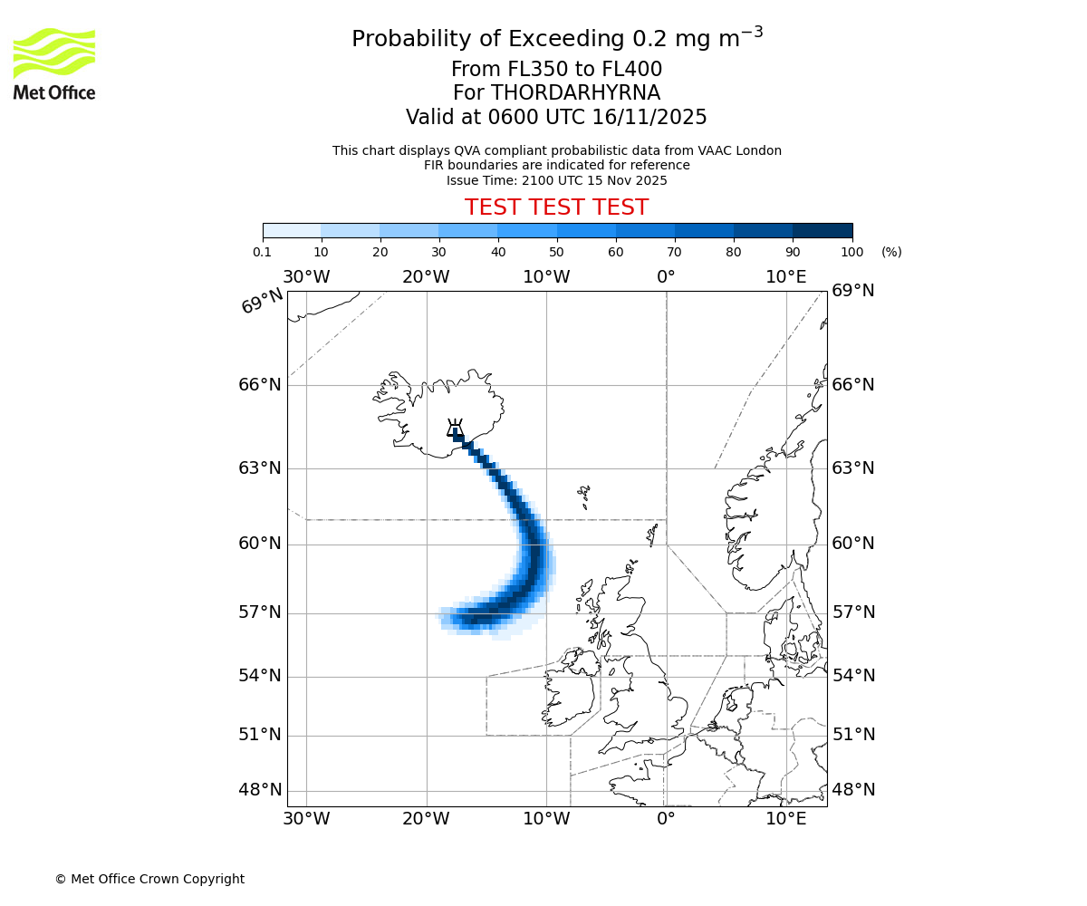Probability of exceeding 0.2 milligrams per metre cubed. From 400 to 450 for THORDARHYRNA. Valid at 0600 UTC 16/11/2025