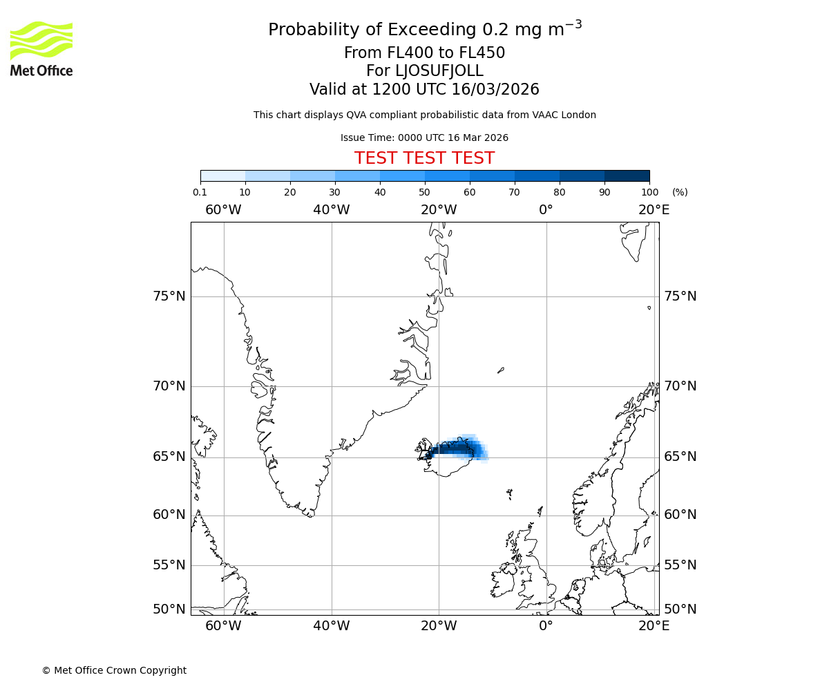 Probability of exceeding 0.2 milligrams per metre cubed. From 400 to 450 for LJOSUFJOLL. Valid at 0900 UTC 16/03/2026