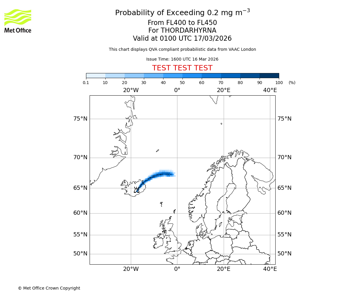 Probability of exceeding 0.2 milligrams per metre cubed. From 400 to 450 for THORDARHYRNA. Valid at 2200 UTC 16/03/2026