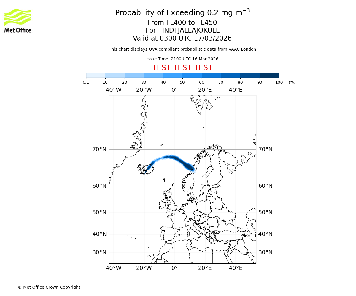 Probability of exceeding 0.2 milligrams per metre cubed. From 400 to 450 for TINDFJALLAJOKULL. Valid at 0000 UTC 17/03/2026