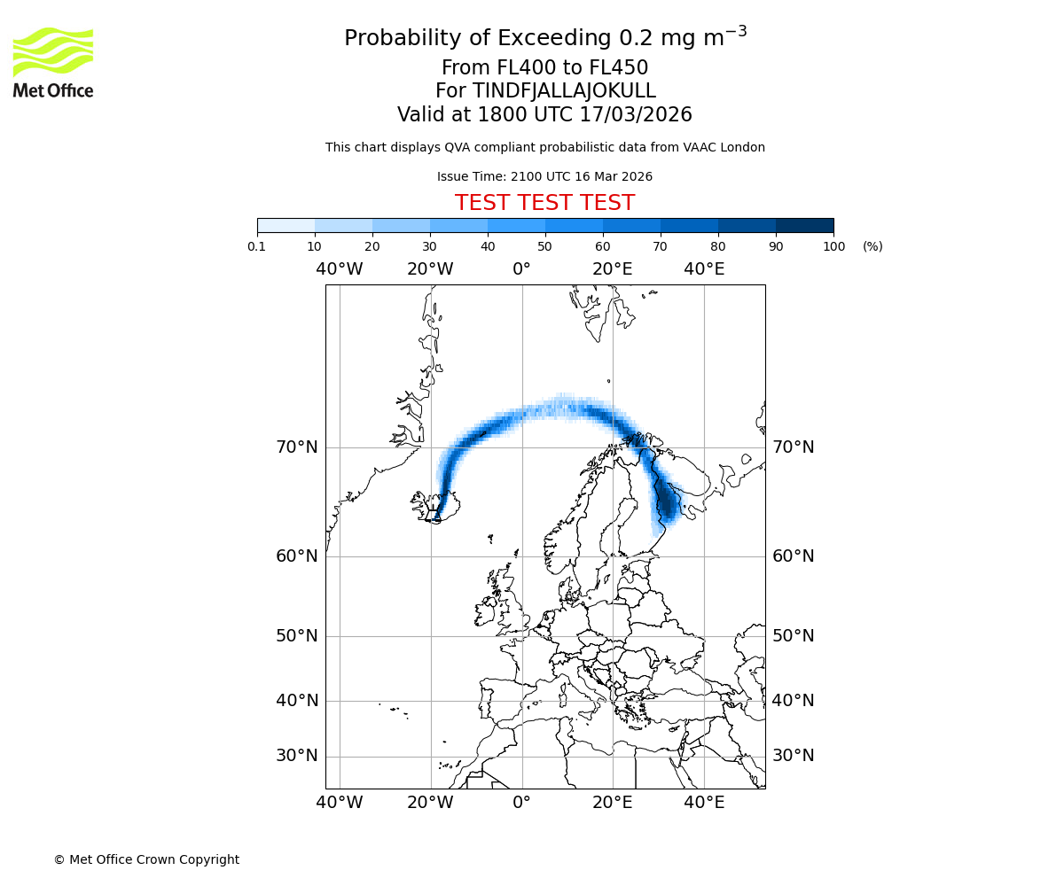 Modelled ash concentration from 000 to 200 for TINDFJALLAJOKULL. Valid at 2100 UTC 16/03/2026