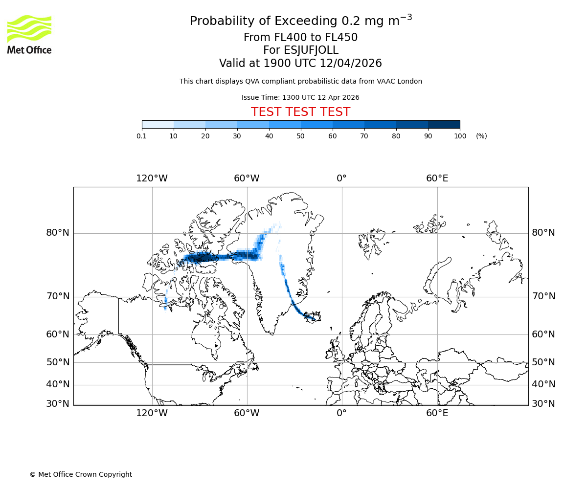 Quantitative Volcanic Ash charts (QVA) are produced in accordance with International Civil Aviation Organization (ICAO) Annex 3 requirements and are provided as well as the London Volcanic Ash Advisory Graphics (VAG) and Advisories (VAA). The lowest QVA threshold (0.2 mg/m³) matches to the areas depicted in the VAA and VAG. Both expected ash concentration and probabilistic forecast information is provided in the chart viewer below for eruptions occurring in the London Volcanic Ash Advisory Centre (VAAC) area of responsibility.