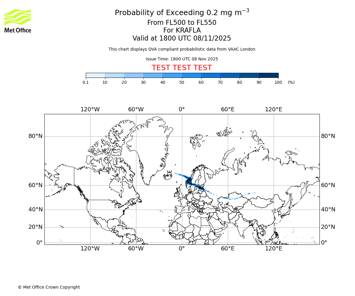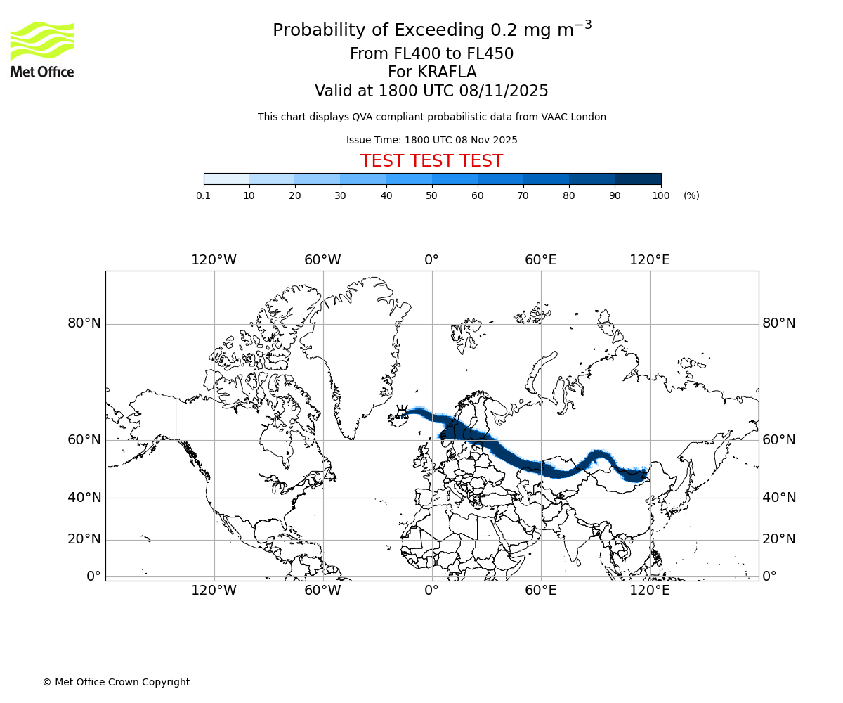 In accordance with ICAO Annex 3, Amendment 82 VAAC London will provide operational QVA forecasts from 27 November 2025 and these will be made available via a VAAC London QVA API information service. These charts are currently provided for test and evaluation purposes (not for operational use) until the introduction of the operational service.
