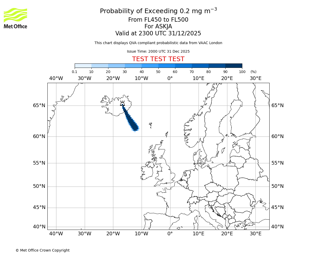 Probability of exceeding 0.2 milligrams per metre cubed. From 450 to 500 for ASKJA. Valid at 2000 UTC 31/12/2025