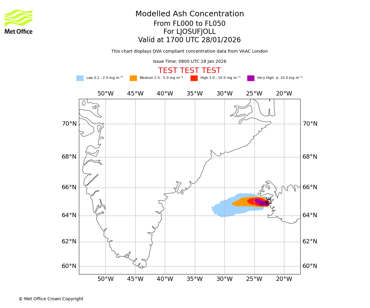 Modelled ash concentration from 000 to 050 for LJOSUFJOLL. Valid at 1400 UTC 28/01/2026