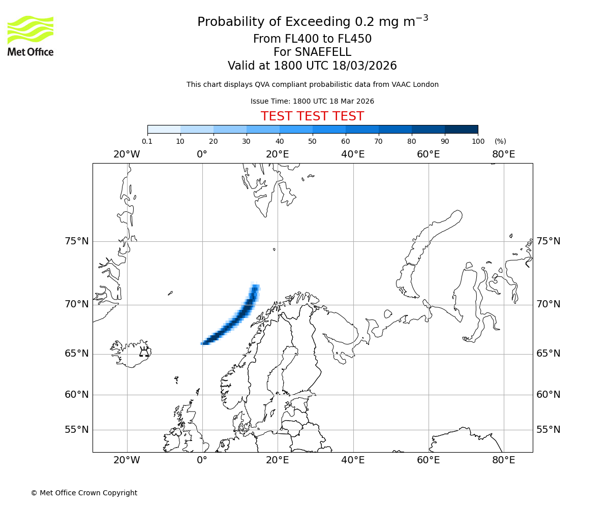 Quantitative Volcanic Ash charts (QVA) are produced in accordance with International Civil Aviation Organization (ICAO) Annex 3 requirements and are provided as well as the London Volcanic Ash Advisory Graphics (VAG) and Advisories (VAA). The lowest QVA threshold (0.2 mg/m³) matches to the areas depicted in the VAA and VAG. Both expected ash concentration and probabilistic forecast information is provided in the chart viewer below for eruptions occurring in the London Volcanic Ash Advisory Centre (VAAC) area of responsibility.