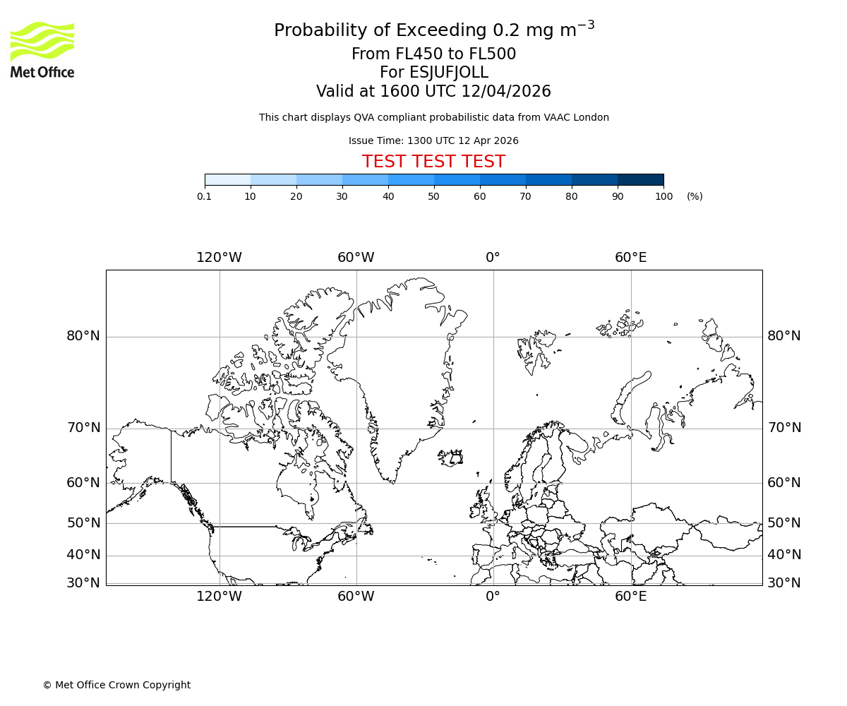 Quantitative Volcanic Ash charts (QVA) are produced in accordance with International Civil Aviation Organization (ICAO) Annex 3 requirements and are provided as well as the London Volcanic Ash Advisory Graphics (VAG) and Advisories (VAA). The lowest QVA threshold (0.2 mg/m³) matches to the areas depicted in the VAA and VAG. Both expected ash concentration and probabilistic forecast information is provided in the chart viewer below for eruptions occurring in the London Volcanic Ash Advisory Centre (VAAC) area of responsibility.