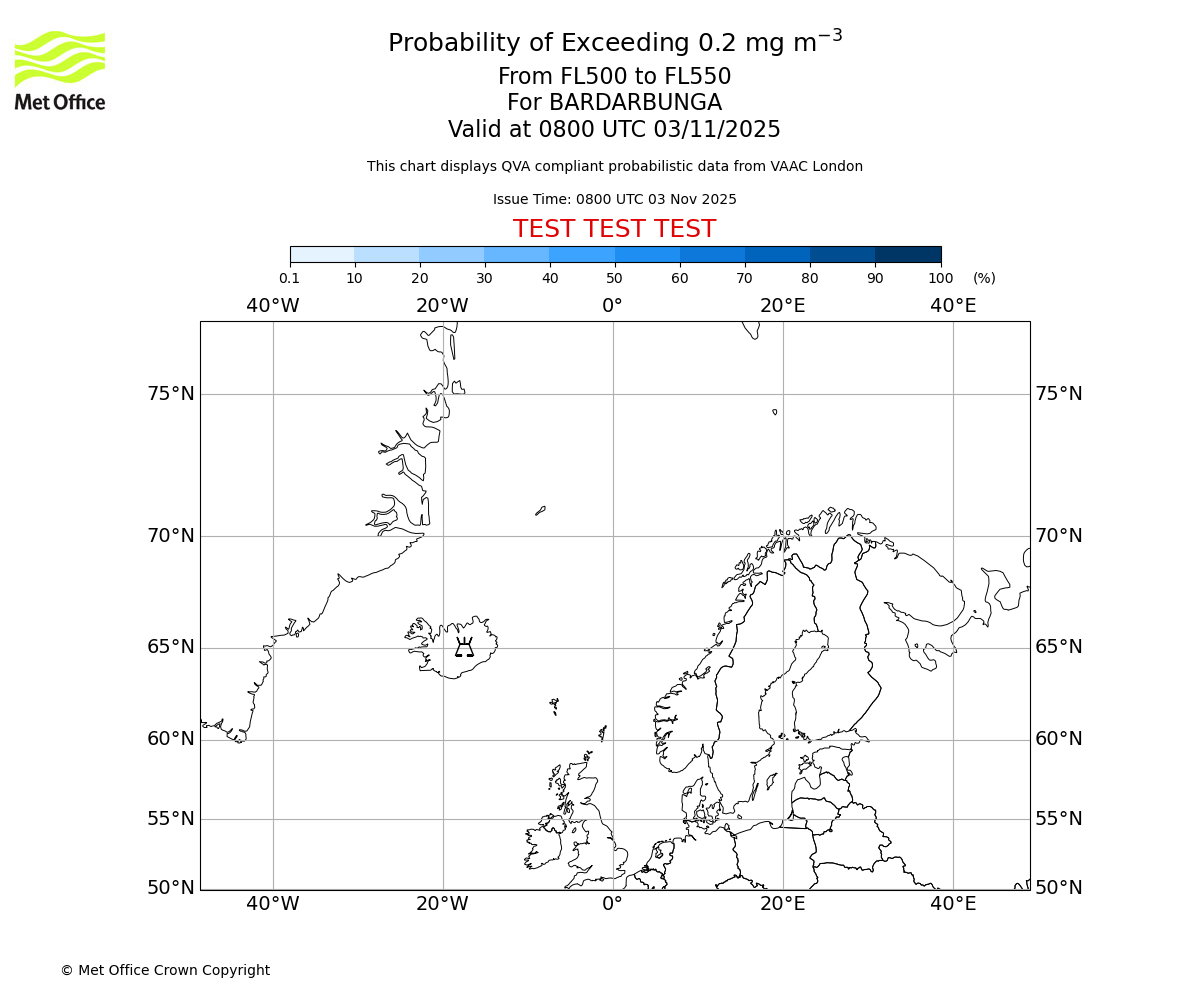 In accordance with ICAO Annex 3, Amendment 82 VAAC London will provide operational QVA forecasts from 27 November 2025 and these will be made available via a VAAC London QVA API information service. These charts are currently provided for test and evaluation purposes (not for operational use) until the introduction of the operational service.