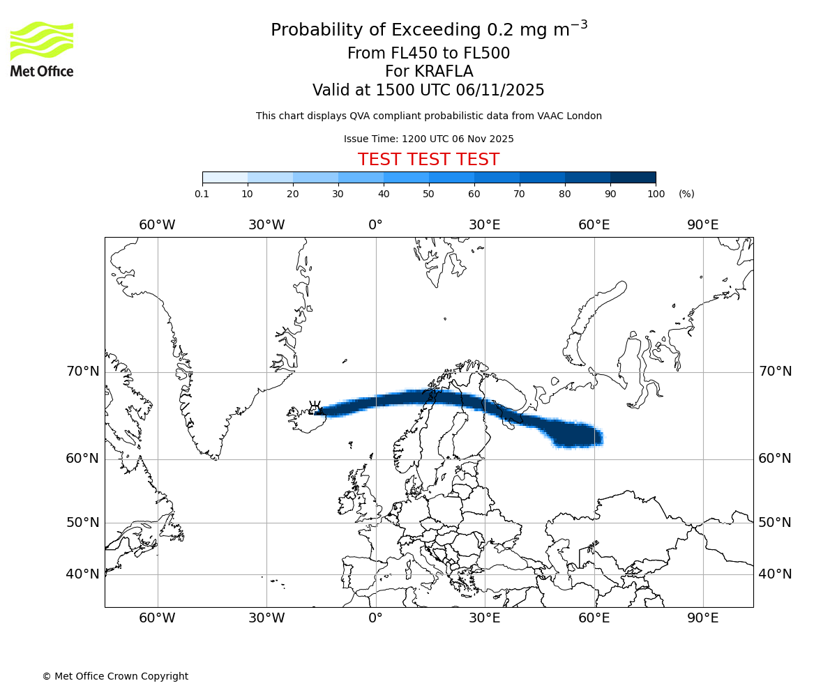 In accordance with ICAO Annex 3, Amendment 82 VAAC London will provide operational QVA forecasts from 27 November 2025 and these will be made available via a VAAC London QVA API information service. These charts are currently provided for test and evaluation purposes (not for operational use) until the introduction of the operational service.