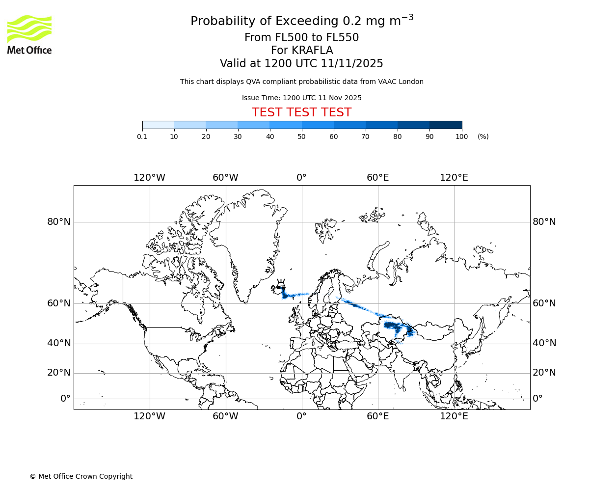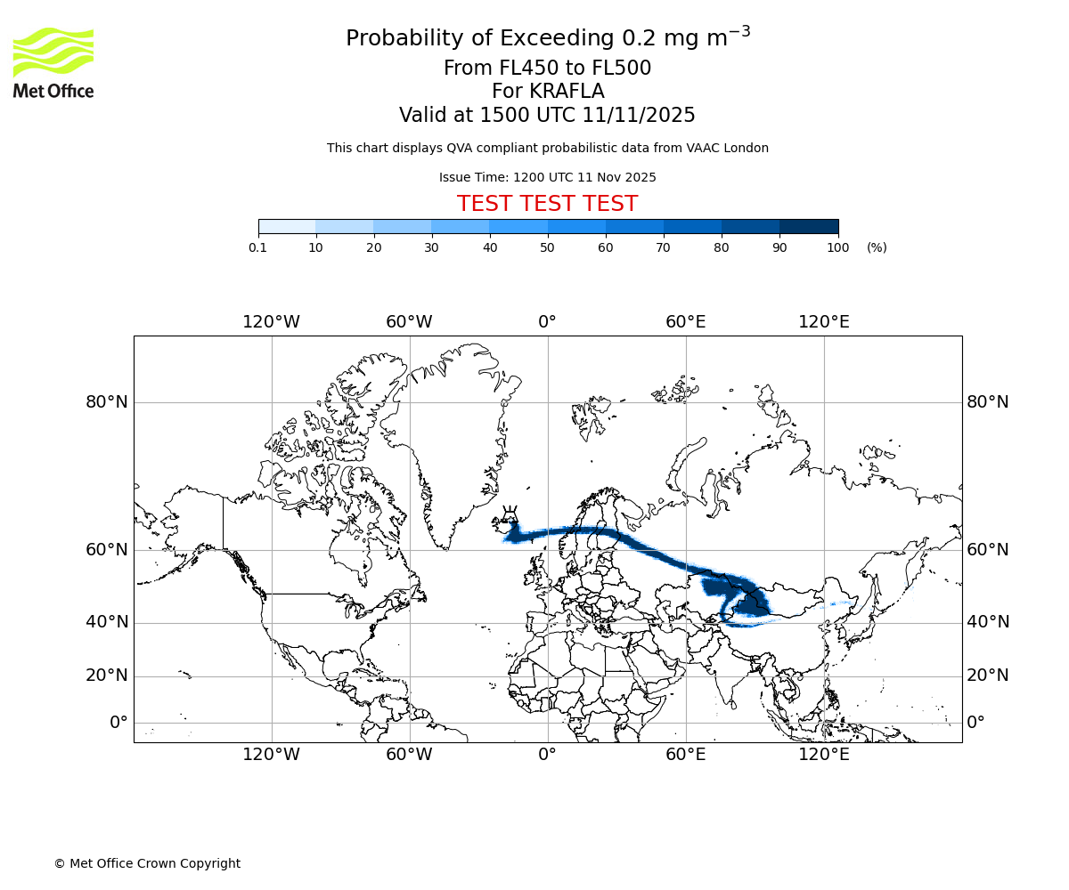 In accordance with ICAO Annex 3, Amendment 82 VAAC London will provide operational QVA forecasts from 27 November 2025 and these will be made available via a VAAC London QVA API information service. These charts are currently provided for test and evaluation purposes (not for operational use) until the introduction of the operational service.