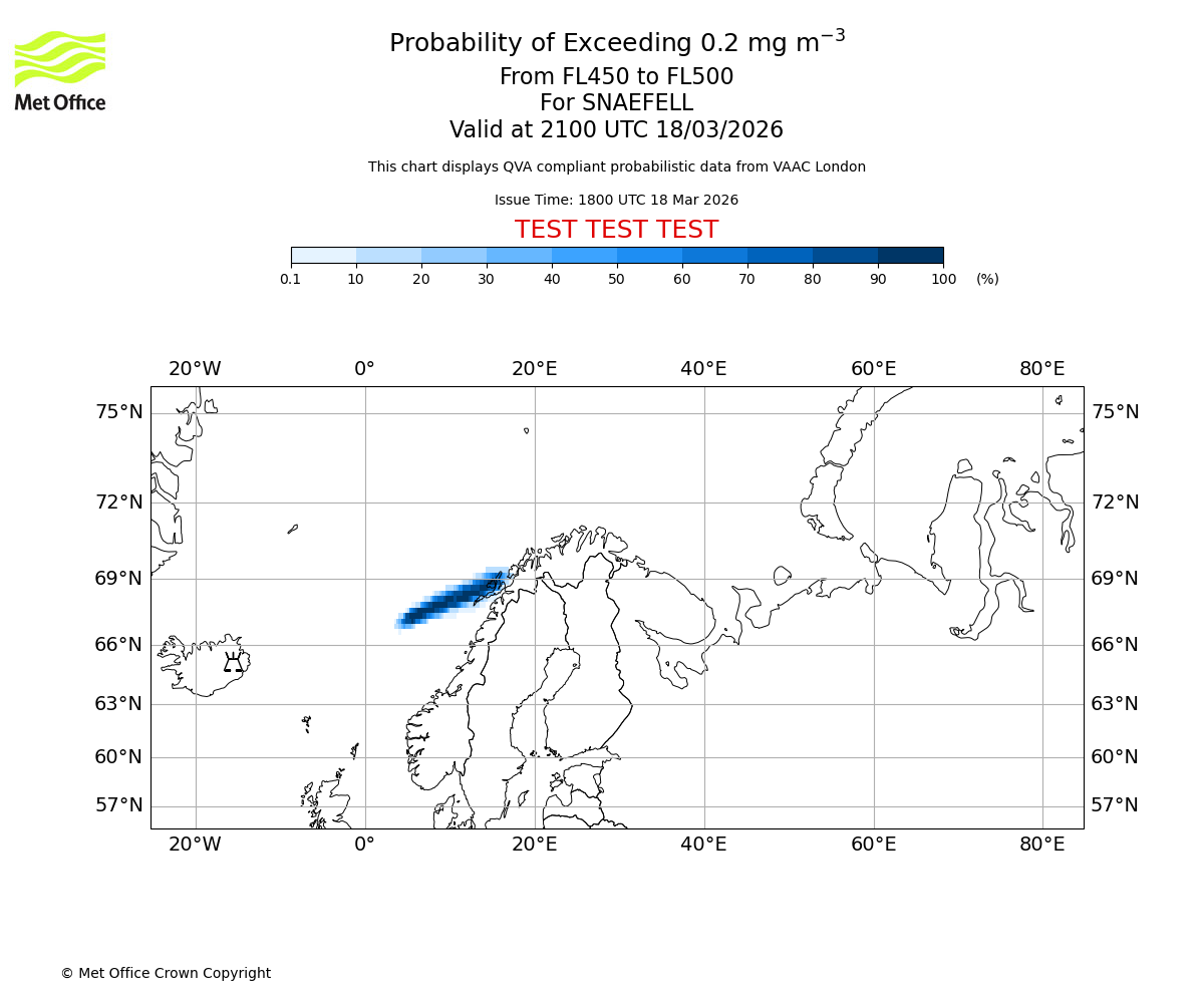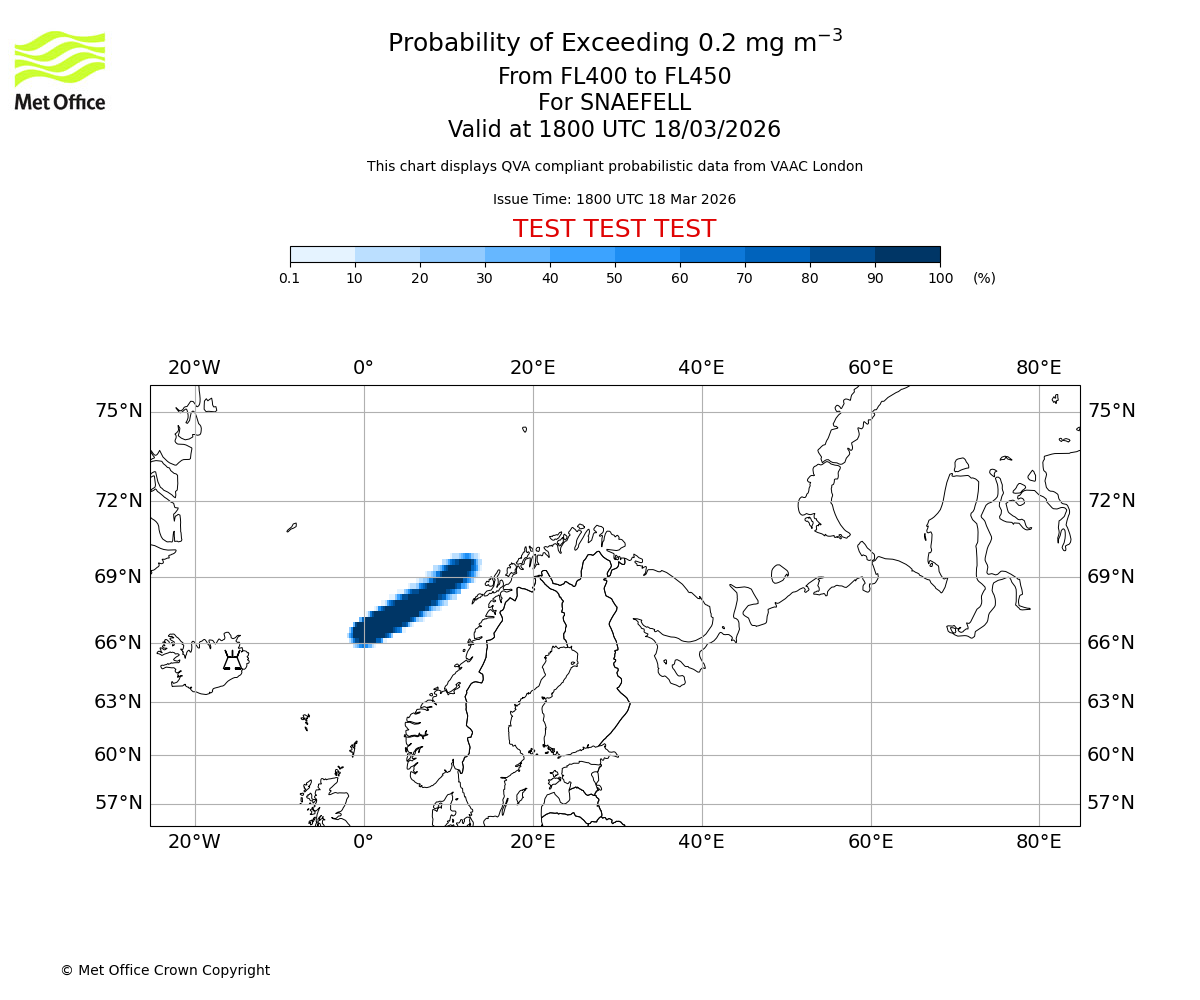 Quantitative Volcanic Ash charts (QVA) are produced in accordance with International Civil Aviation Organization (ICAO) Annex 3 requirements and are provided as well as the London Volcanic Ash Advisory Graphics (VAG) and Advisories (VAA). The lowest QVA threshold (0.2 mg/m³) matches to the areas depicted in the VAA and VAG. Both expected ash concentration and probabilistic forecast information is provided in the chart viewer below for eruptions occurring in the London Volcanic Ash Advisory Centre (VAAC) area of responsibility.