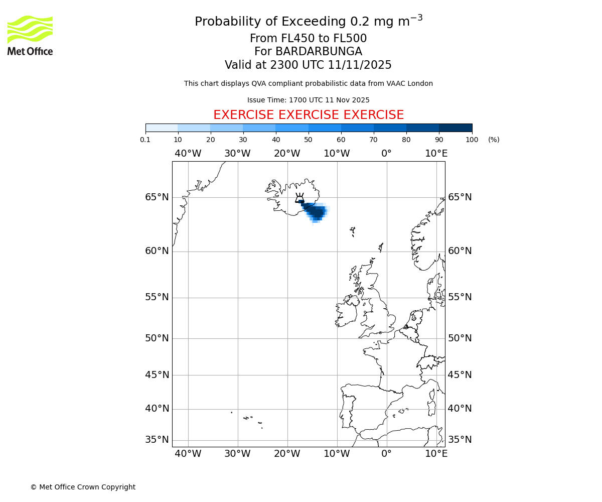 Probability of exceeding 0.2 milligrams per metre cubed. From 450 to 500 for BARDARBUNGA. Valid at 2000 UTC 11/11/2025