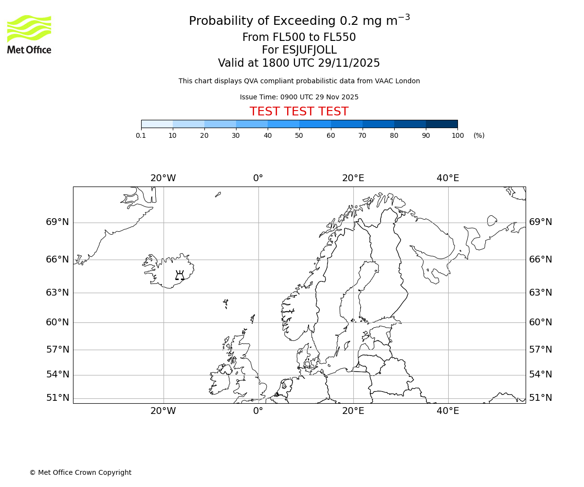 Modelled ash concentration from 000 to 200 for ESJUFJOLL. Valid at 0900 UTC 29/11/2025