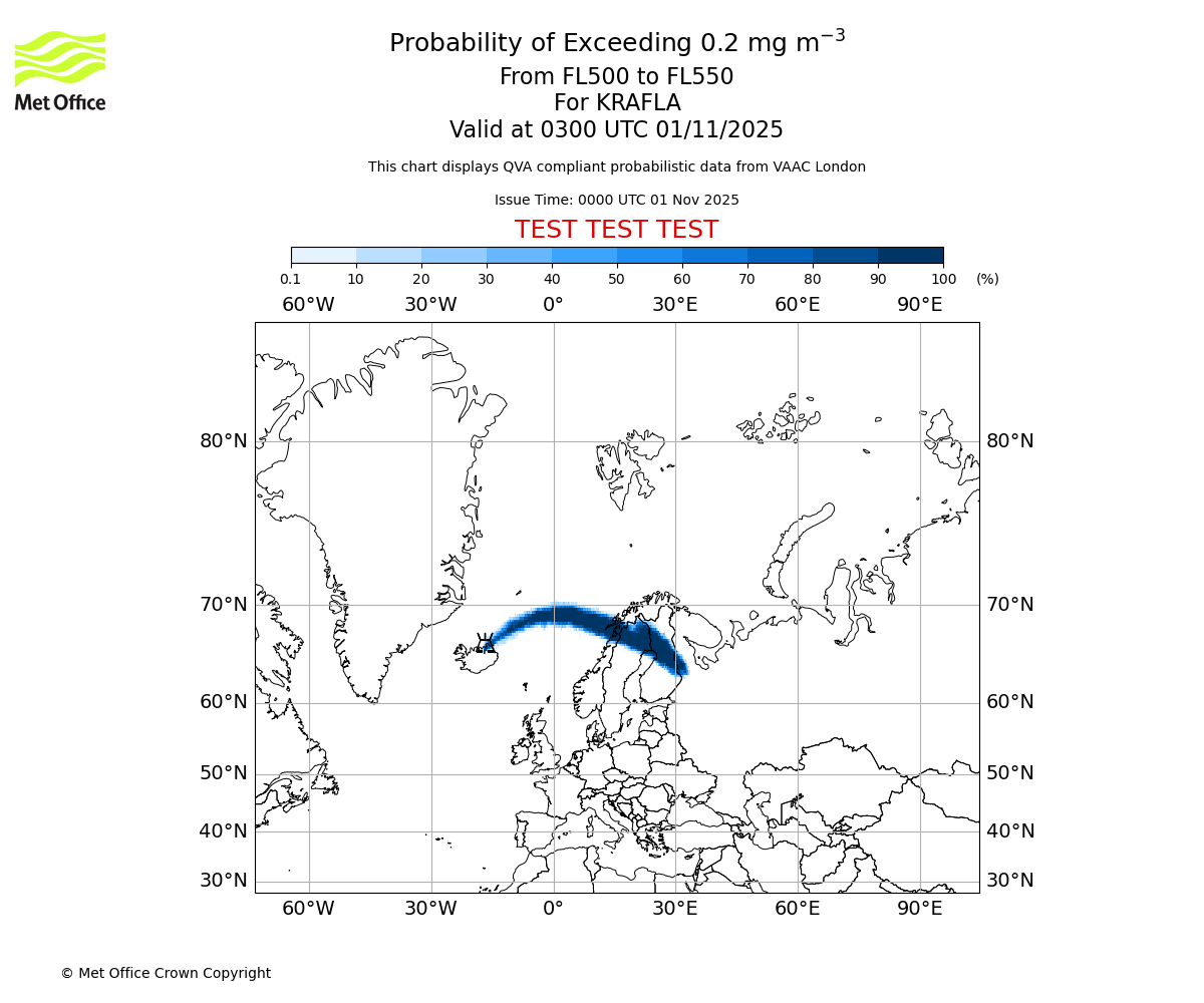 In accordance with ICAO Annex 3, Amendment 82 VAAC London will provide operational QVA forecasts from 27 November 2025 and these will be made available via a VAAC London QVA API information service. These charts are currently provided for test and evaluation purposes (not for operational use) until the introduction of the operational service.