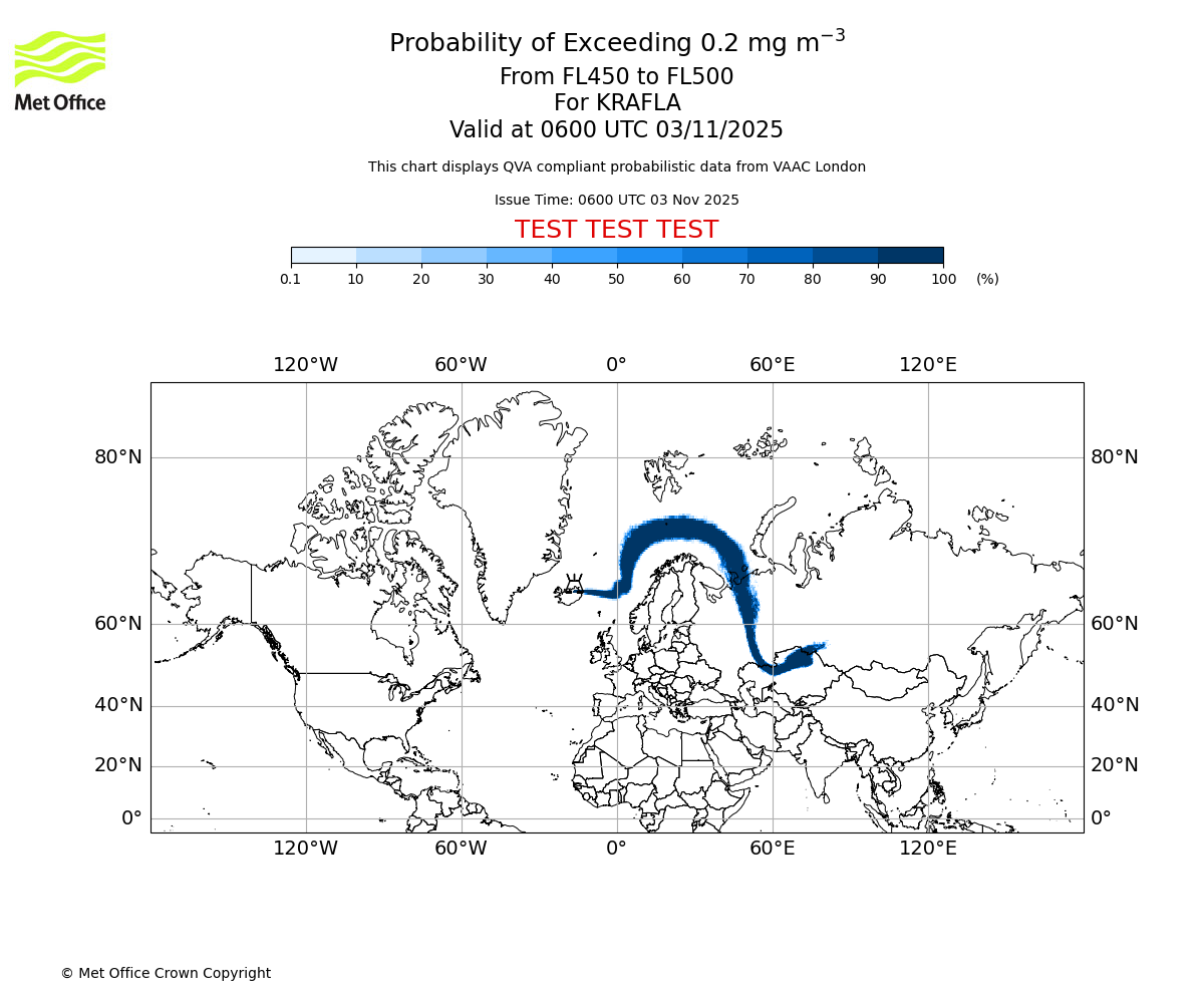 In accordance with ICAO Annex 3, Amendment 82 VAAC London will provide operational QVA forecasts from 27 November 2025 and these will be made available via a VAAC London QVA API information service. These charts are currently provided for test and evaluation purposes (not for operational use) until the introduction of the operational service.