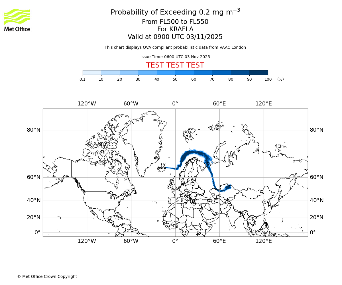 Probability of exceeding 0.2 milligrams per metre cubed. From 500 to 550 for KRAFLA. Valid at 0600 UTC 03/11/2025