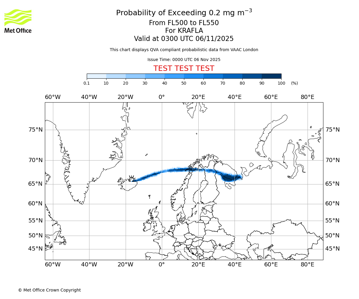In accordance with ICAO Annex 3, Amendment 82 VAAC London will provide operational QVA forecasts from 27 November 2025 and these will be made available via a VAAC London QVA API information service. These charts are currently provided for test and evaluation purposes (not for operational use) until the introduction of the operational service.
