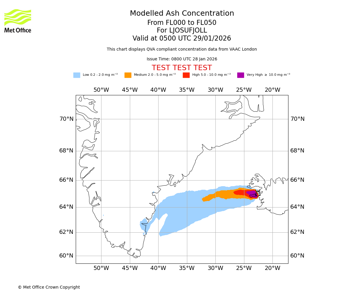 Modelled ash concentration from 000 to 050 for LJOSUFJOLL. Valid at 0200 UTC 29/01/2026