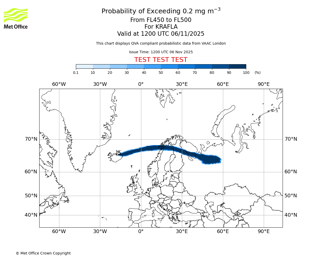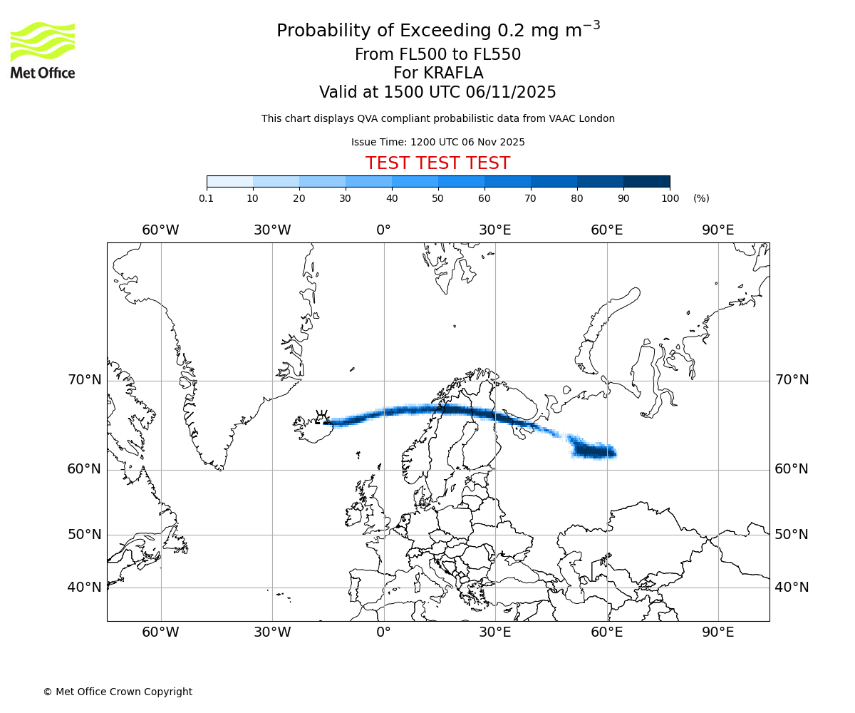 In accordance with ICAO Annex 3, Amendment 82 VAAC London will provide operational QVA forecasts from 27 November 2025 and these will be made available via a VAAC London QVA API information service. These charts are currently provided for test and evaluation purposes (not for operational use) until the introduction of the operational service.