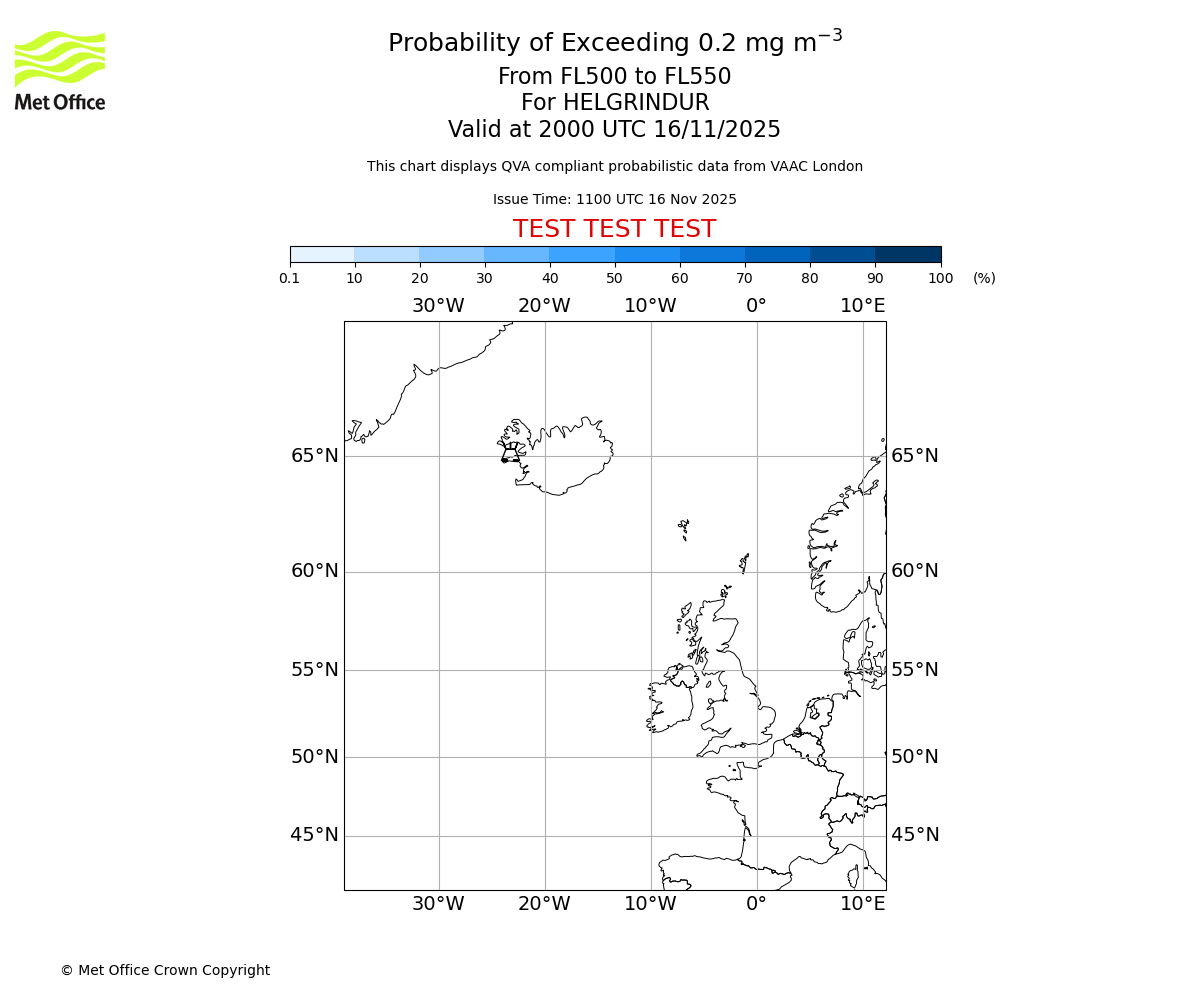 In accordance with ICAO Annex 3, Amendment 82 VAAC London will provide operational QVA forecasts from 27 November 2025 and these will be made available via a VAAC London QVA API information service. These charts are currently provided for test and evaluation purposes (not for operational use) until the introduction of the operational service.