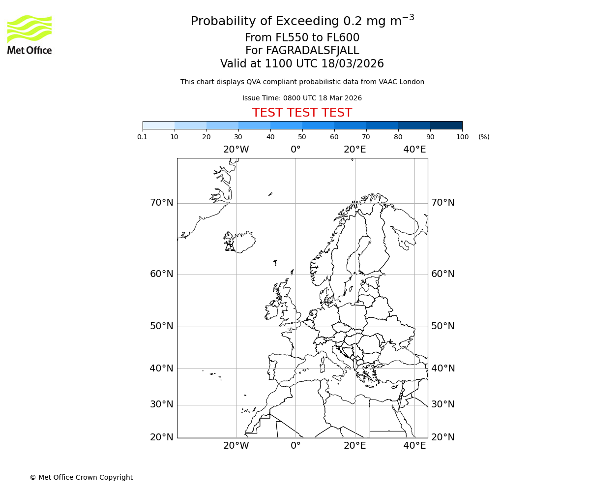 Probability of exceeding 0.2 milligrams per metre cubed. From 550 to 600 for FAGRADALSFJALL. Valid at 0800 UTC 18/03/2026