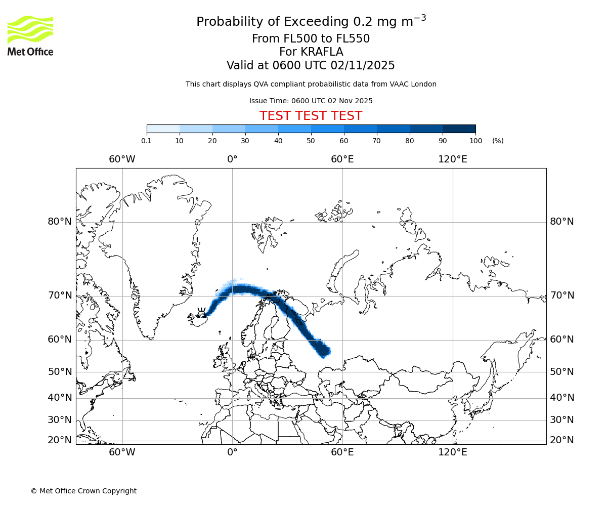 In accordance with ICAO Annex 3, Amendment 82 VAAC London will provide operational QVA forecasts from 27 November 2025 and these will be made available via a VAAC London QVA API information service. These charts are currently provided for test and evaluation purposes (not for operational use) until the introduction of the operational service.
