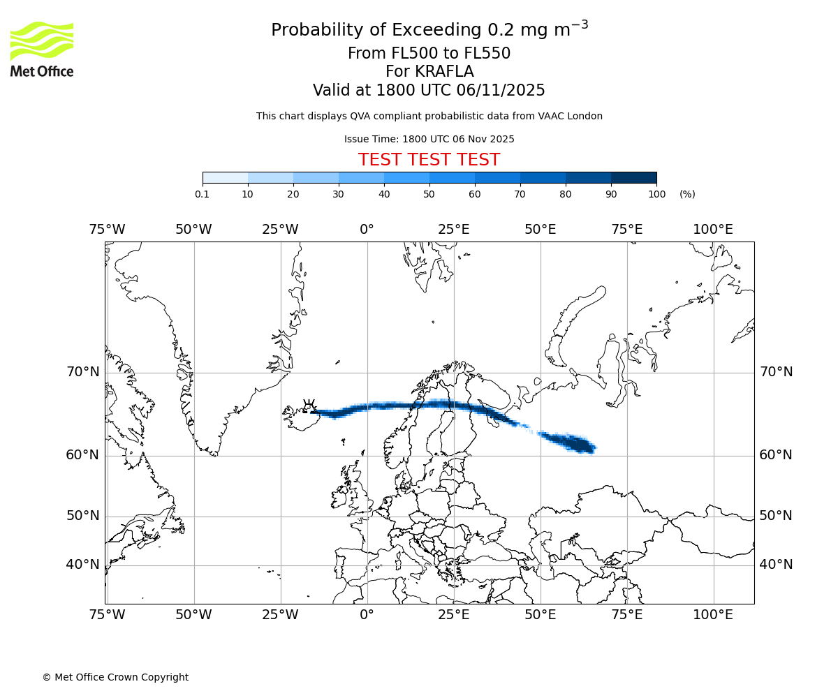 In accordance with ICAO Annex 3, Amendment 82 VAAC London will provide operational QVA forecasts from 27 November 2025 and these will be made available via a VAAC London QVA API information service. These charts are currently provided for test and evaluation purposes (not for operational use) until the introduction of the operational service.