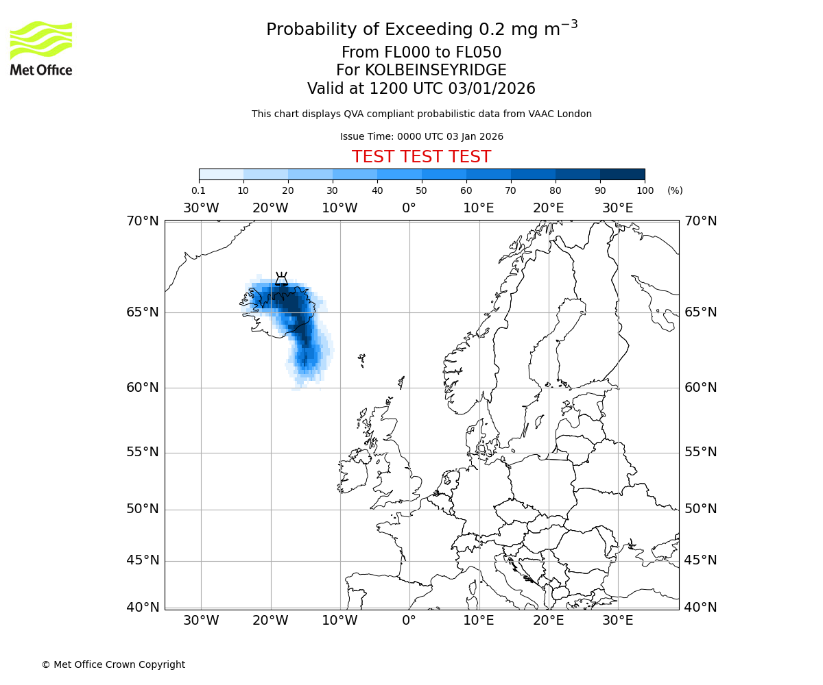Modelled ash concentration from 000 to 200 for KOLBEINSEYRIDGE. Valid at 0000 UTC 03/01/2026
