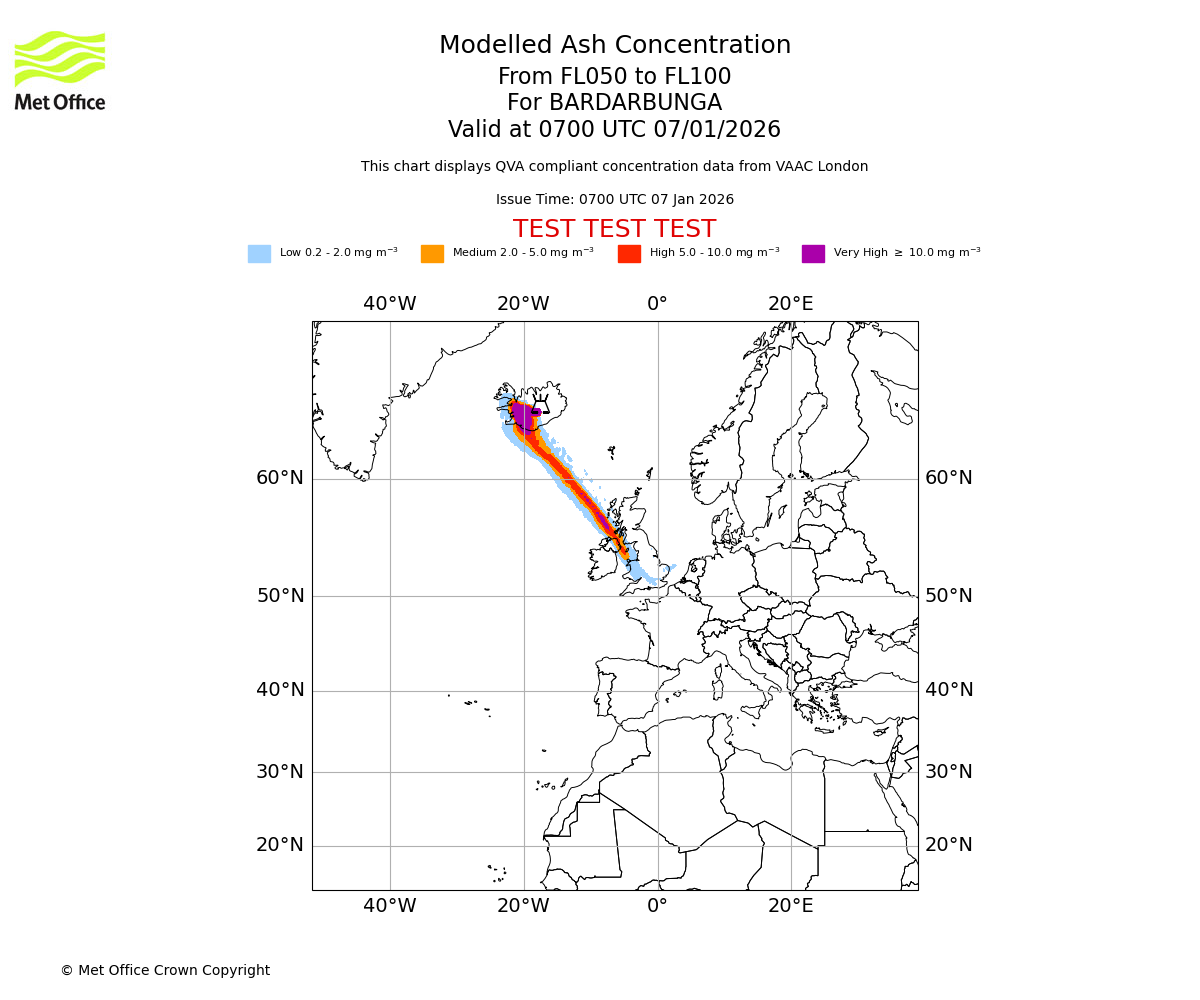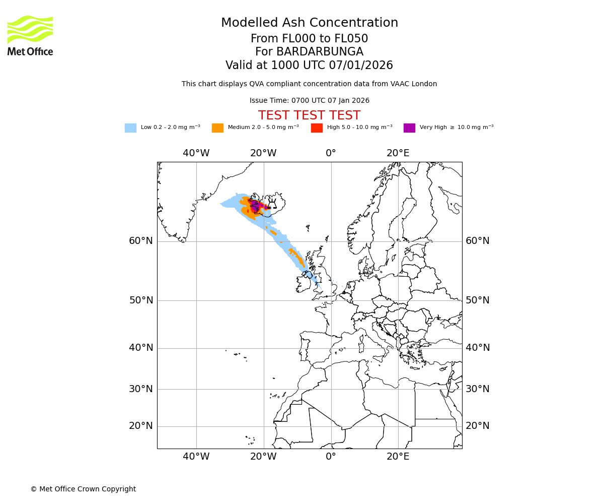 Modelled ash concentration from 000 to 050 for BARDARBUNGA. Valid at 0700 UTC 07/01/2026