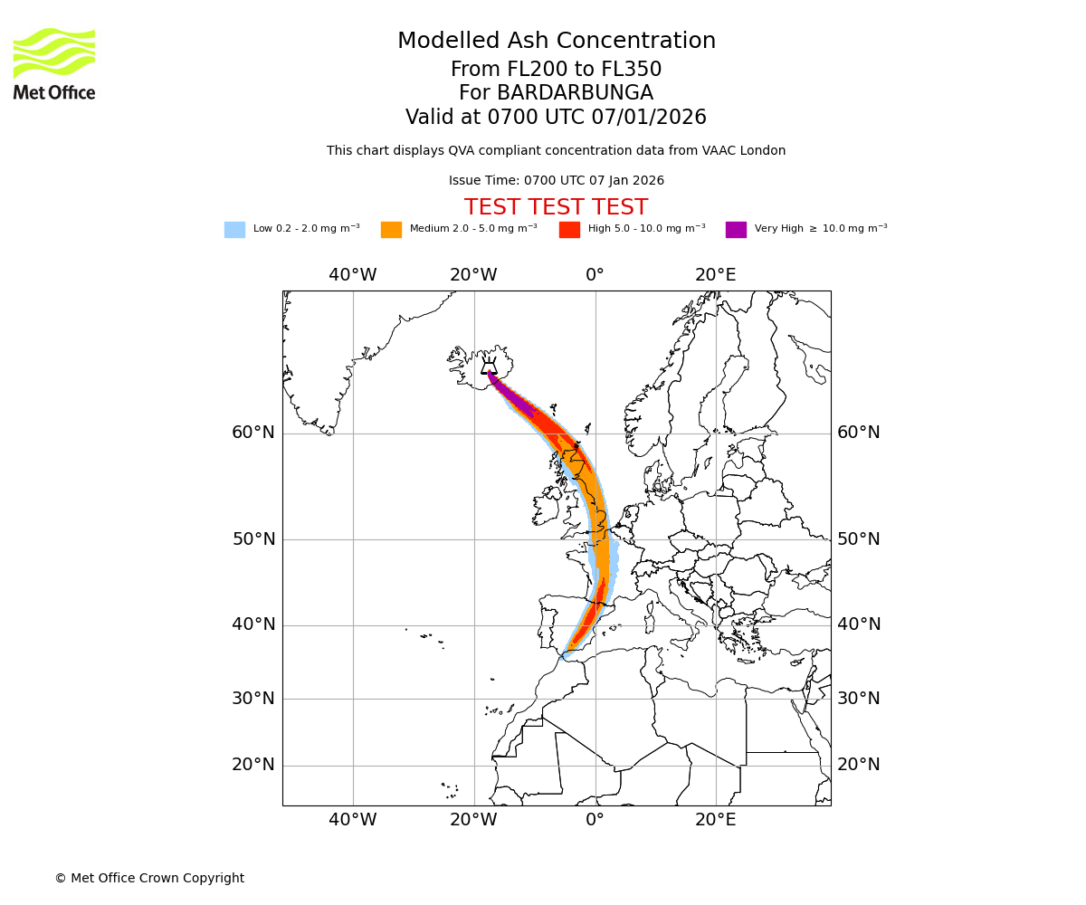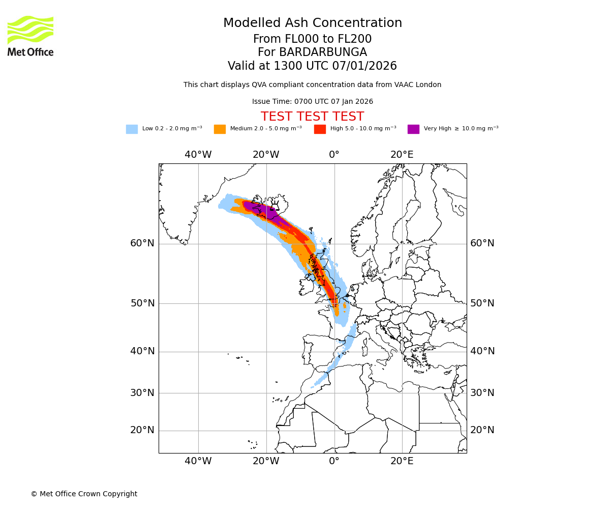 Modelled ash concentration from 000 to 200 for BARDARBUNGA. Valid at 0700 UTC 07/01/2026
