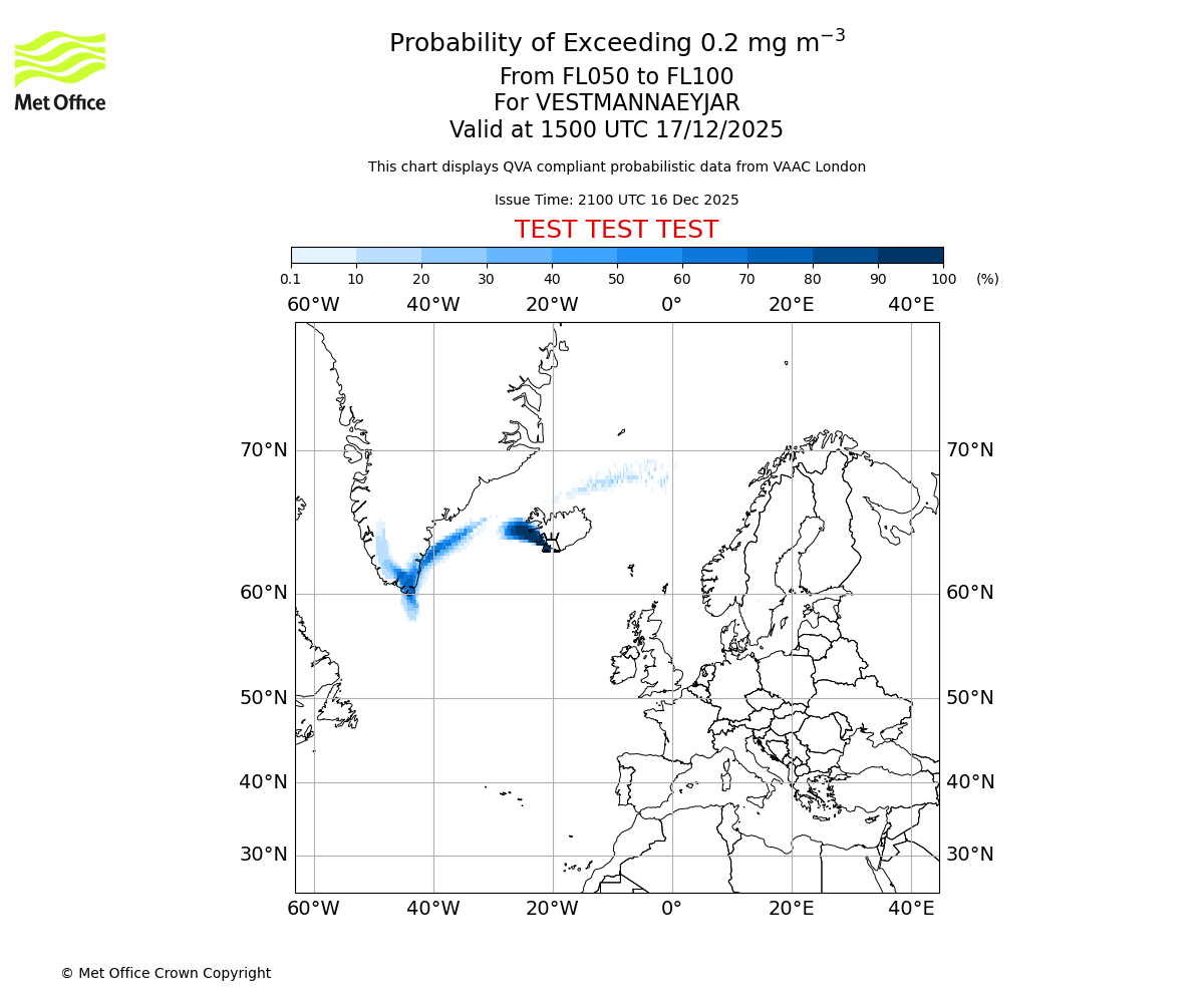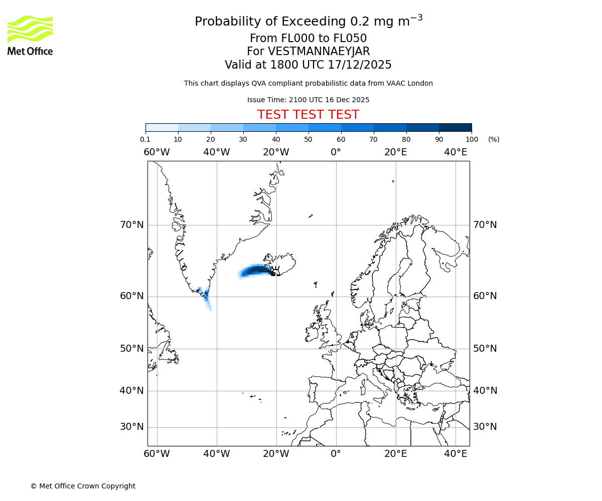 Modelled ash concentration from 000 to 200 for VESTMANNAEYJAR. Valid at 2100 UTC 16/12/2025
