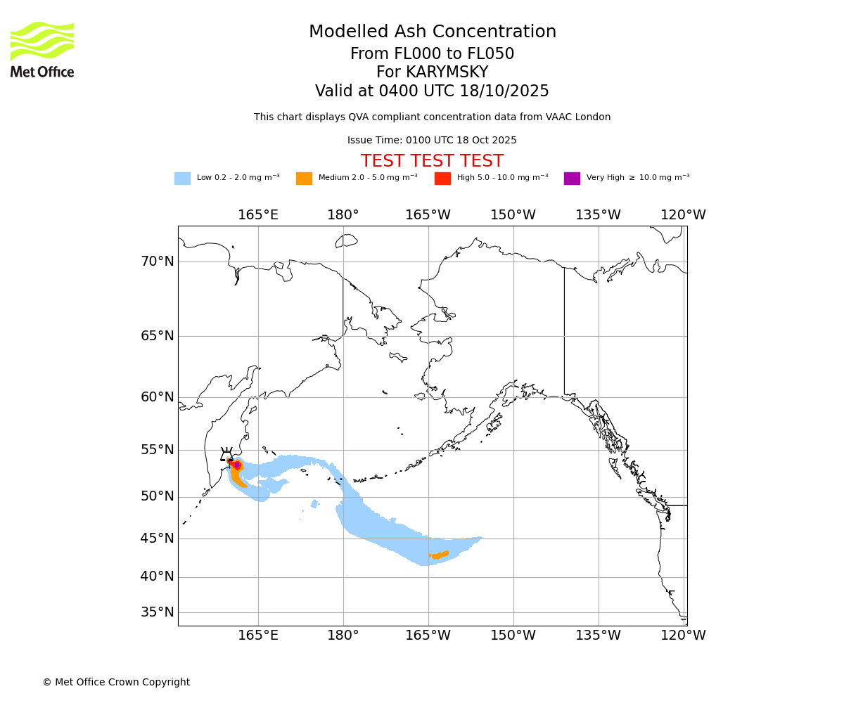 Modelled ash concentration from 000 to 050 for KARYMSKY. Valid at 0100 UTC 18/10/2025