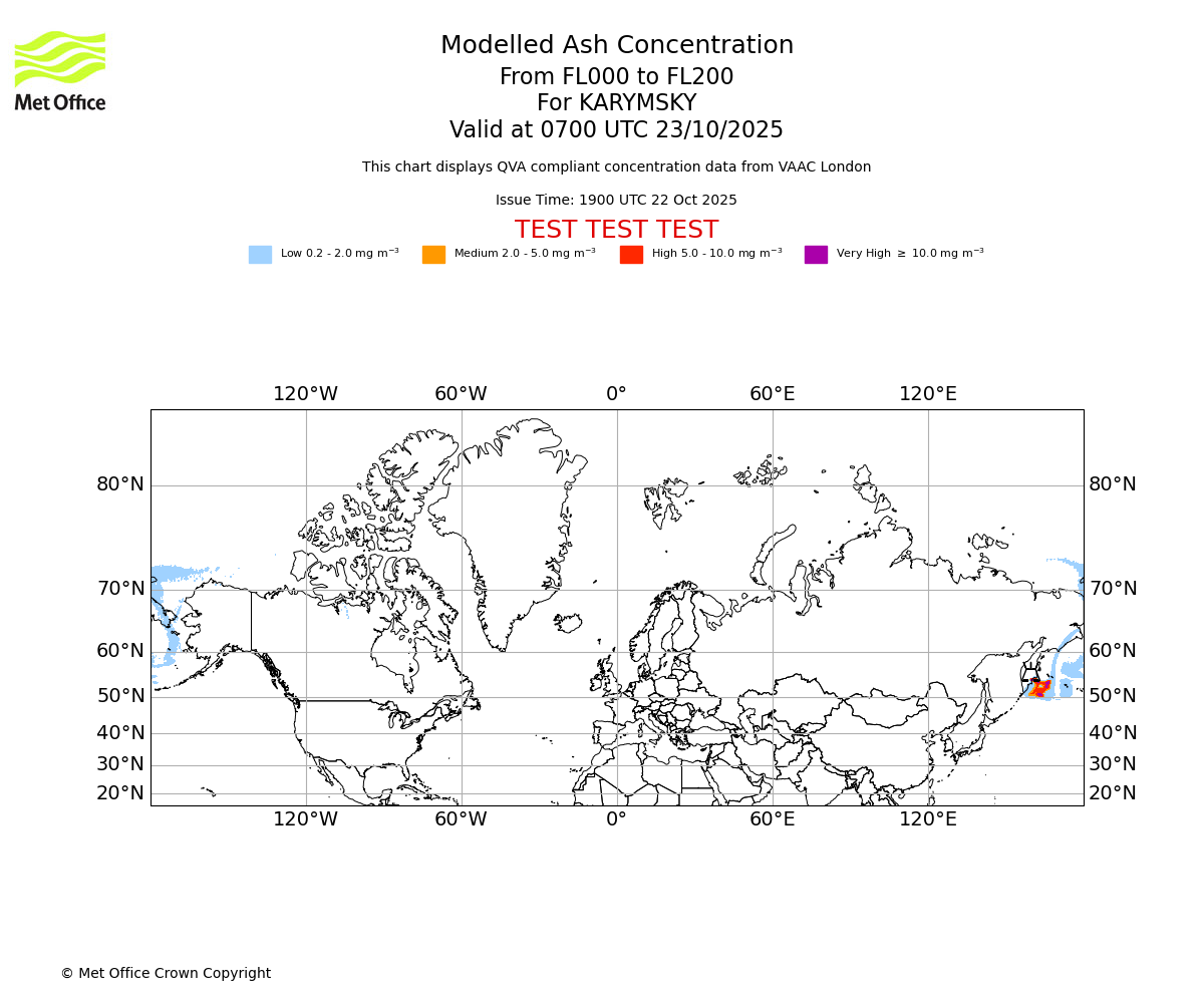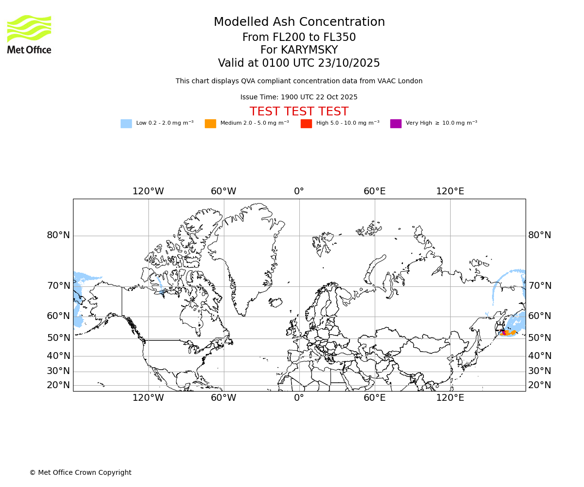 Modelled ash concentration from 000 to 200 for KARYMSKY. Valid at 0100 UTC 23/10/2025