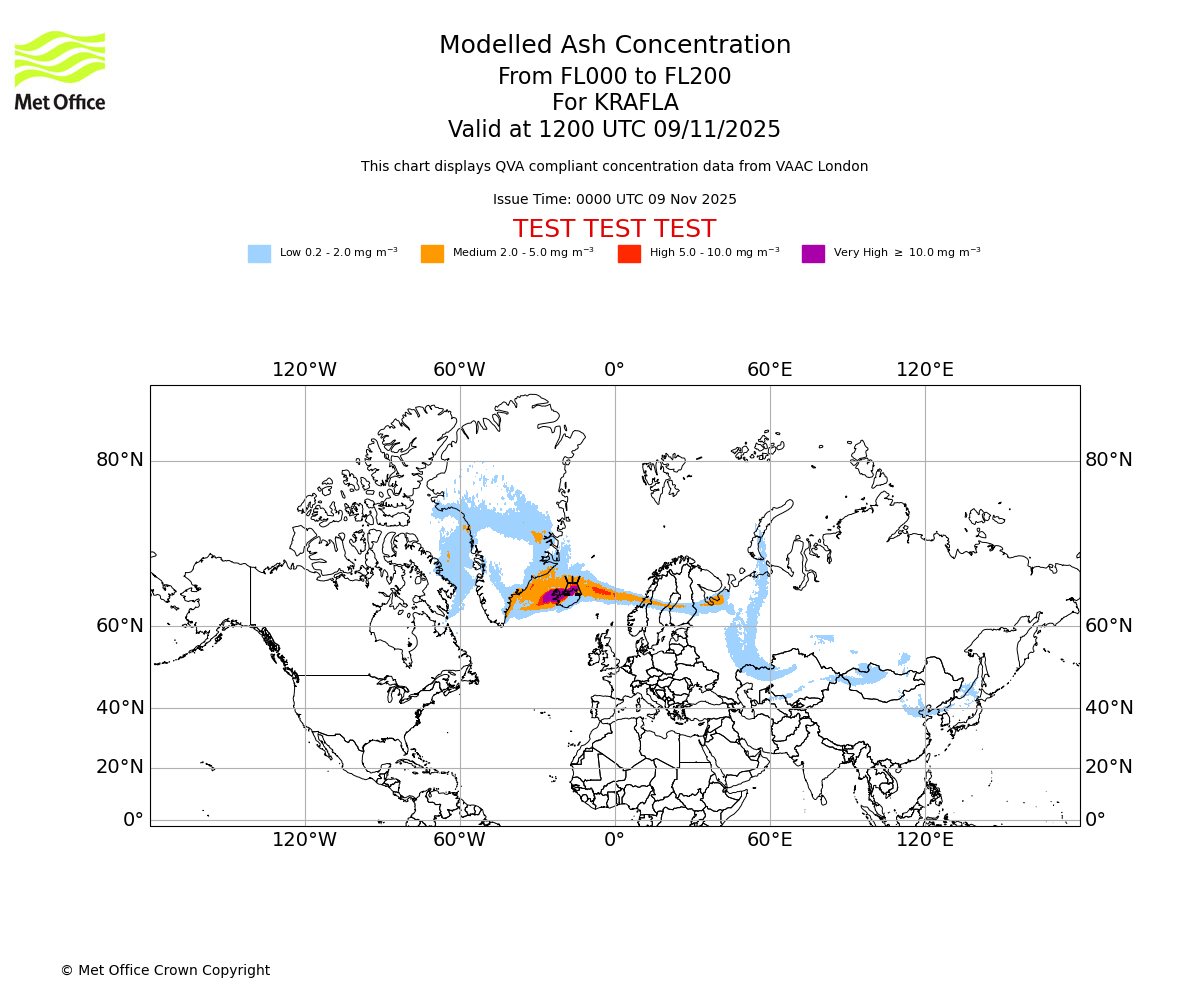 In accordance with ICAO Annex 3, Amendment 82 VAAC London will provide operational QVA forecasts from 27 November 2025 and these will be made available via a VAAC London QVA API information service. These charts are currently provided for test and evaluation purposes (not for operational use) until the introduction of the operational service.