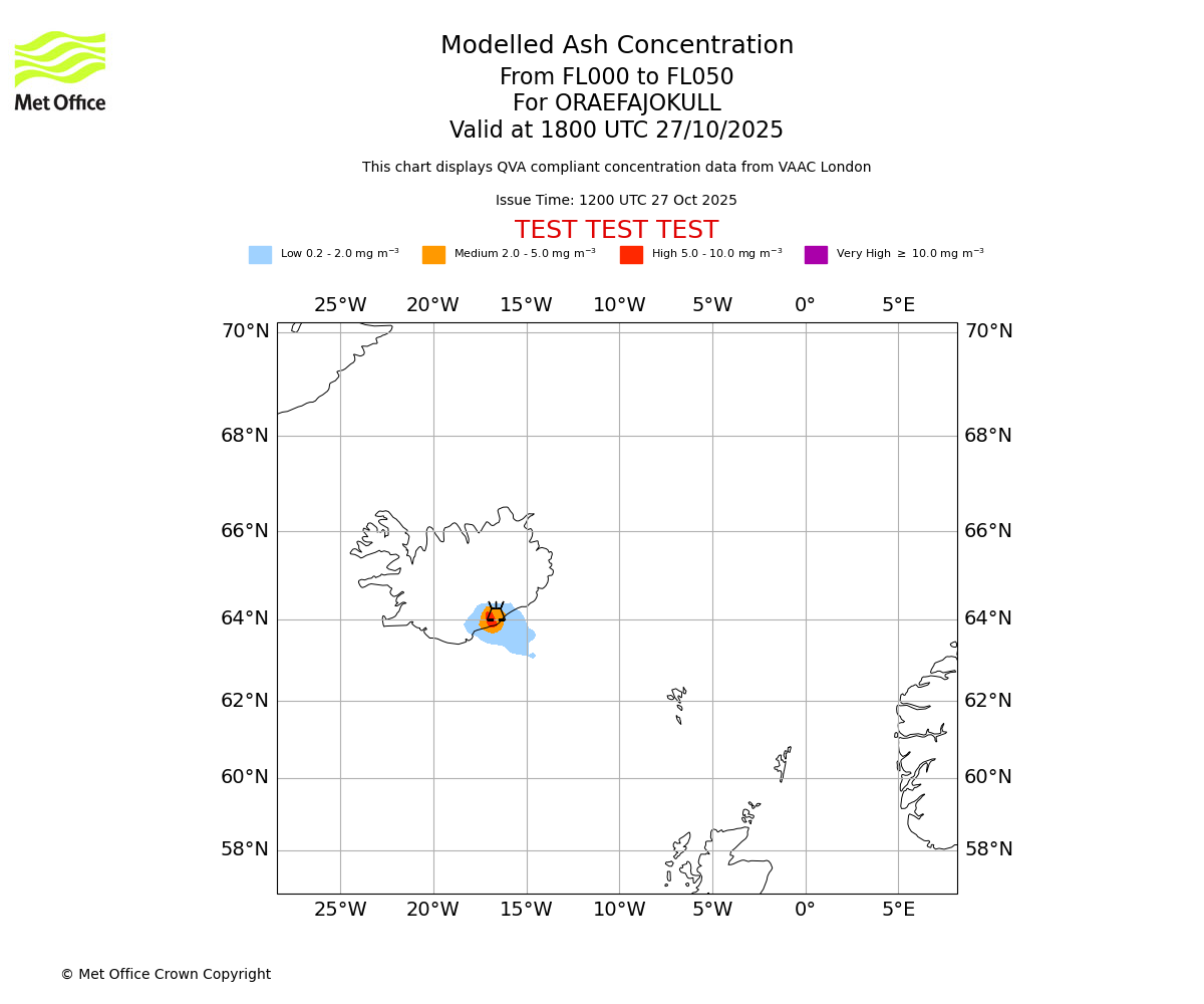 Modelled ash concentration from 000 to 200 for ORAEFAJOKULL. Valid at 1200 UTC 27/10/2025