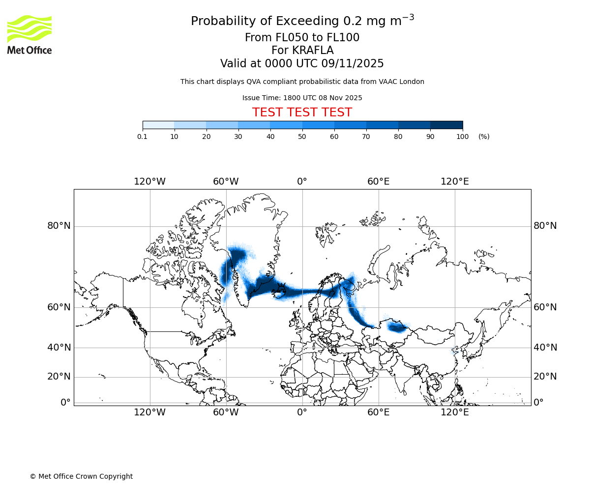 In accordance with ICAO Annex 3, Amendment 82 VAAC London will provide operational QVA forecasts from 27 November 2025 and these will be made available via a VAAC London QVA API information service. These charts are currently provided for test and evaluation purposes (not for operational use) until the introduction of the operational service.