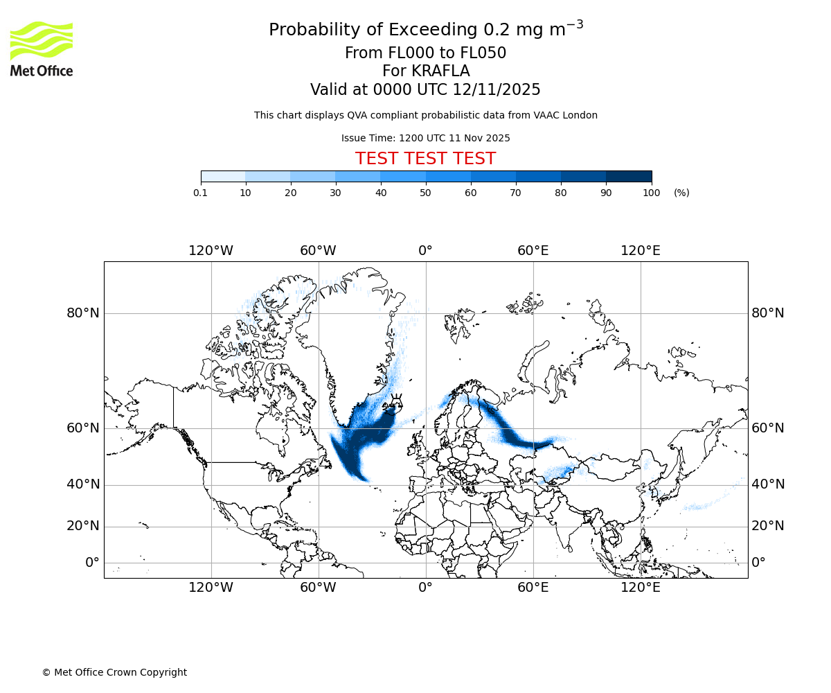 Modelled ash concentration from 000 to 200 for KRAFLA. Valid at 1200 UTC 11/11/2025