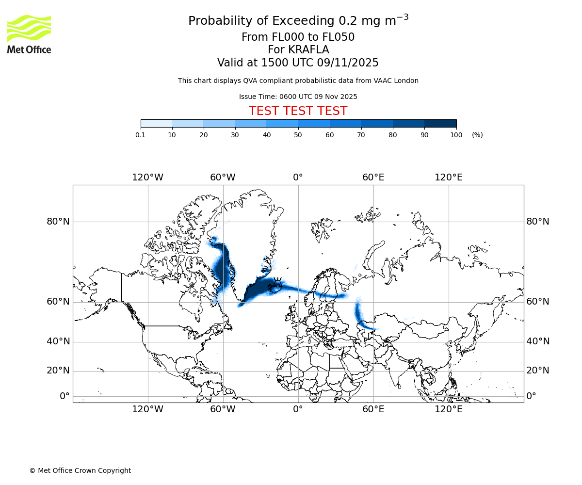 Probability of exceeding 0.2 milligrams per metre cubed. From 000 to 050 for KRAFLA. Valid at 1200 UTC 09/11/2025