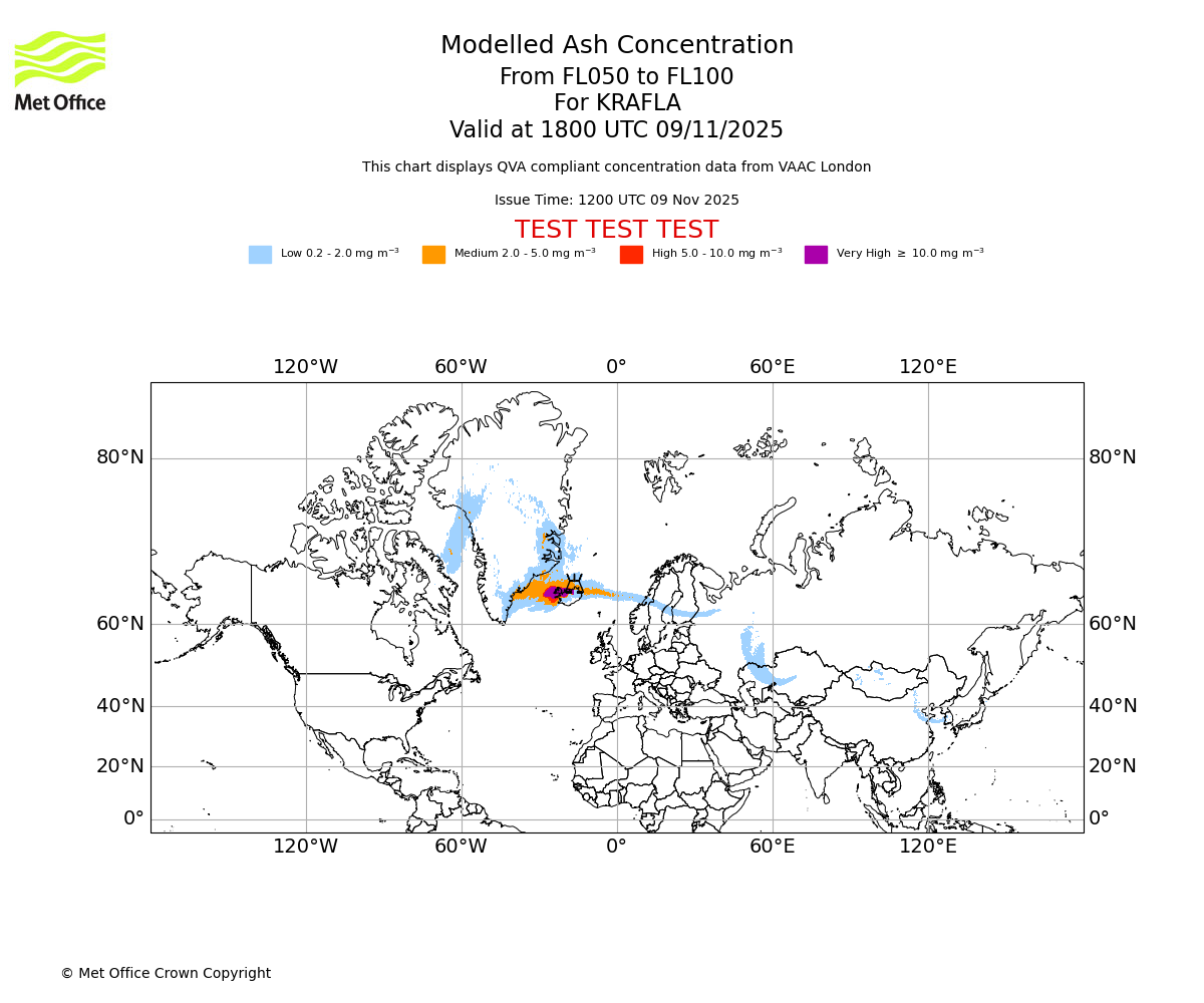 Modelled ash concentration from 000 to 050 for KRAFLA. Valid at 1800 UTC 09/11/2025